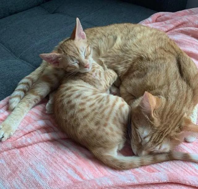 大猫教它如何成为一只合格的猫,给它足够的安全感,把它当成自己的孩子一样疼爱。