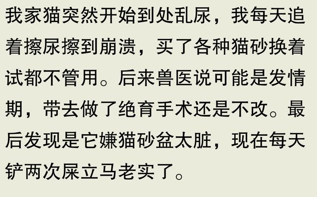 我家猫也是,突然开始到处乱尿,我试了各种方法都没用。后来发现是猫砂盆太脏了,换了新猫砂立马就好了。虽然是小事,但真的要注意细节。