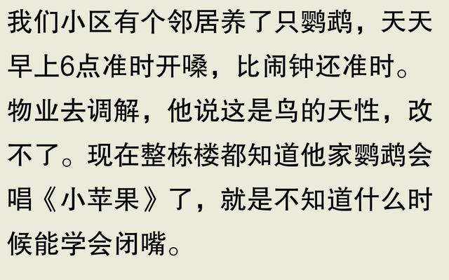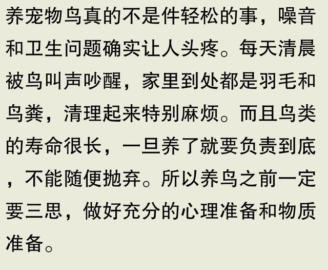 ![]() 04 我们小区有个邻居养了只鹦鹉,天天早上6点准时开嗓,比闹钟还准时。物业去调解,他说这是鸟的天性,改不了。现在整栋楼都知道他家鹦鹉会唱《小苹果》了,就是不知道什么时候能学会闭嘴。 ![]() 05 养宠物鸟真的不是件轻松的事,噪音和卫生问题确实让人头疼。每天清晨被鸟叫声吵醒,家里到处都是羽毛和鸟粪,清理起来特别麻烦。而且鸟类的寿命很长,一旦养了就要负责到底,不能随便抛弃。所以养鸟之前一定要三思,做好充分的心理准备和物质准备。 ![]() 小编评论: 养鸟不是闹着玩的,吵得你睡不着觉,还得天天打扫鸟屎,真不是一般人能受得了的! 大家对这件事怎么看? 欢迎在评论区留言讨论。 |