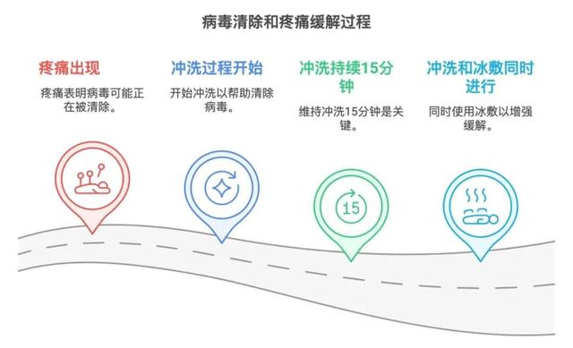 A:疼痛恰恰说明病毒可能被冲出!坚持15分钟是保命关键,可边冲边冰敷缓解疼痛。