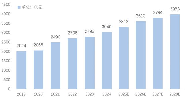 信息来源:融中咨询 宠物相关产品产业链中游市场集中度低,代工厂迅速发展,头部代工厂相继上市。代工厂已建立了完备的原材料供应体系、成熟的产品生产线,宠物市场的迅速发展带动代工厂企业规模扩张。宠物赛道竞争加剧,以代工为主要业务的企业毛利率下降明显,自有品牌已具规模的龙头企业毛利率稳中有升。宠物相关行业头部企业研发费用整体呈上升趋势。宠物市场竞争的加剧促使头部企业不断投入研发以寻求差异化竞争优势,头部企业的研发费用逐年提高,成为推动企业发展的重要力量。 (2)行业市场规模 宠物行业整体呈现上升趋势,主要得益于以下几方面:第一,中国宠物饲养者人数逐渐增多,宠物经济快速发展带动宠物行业规模增长。中国经济快速发展,老龄化、少子化的人口特征逐步显现,导致中国传统的家庭结构有所改变,对于情感的需求愈发旺盛。中国宠物(犬猫)数量由2017年的8,746万只增长至2024年的12,411万只,2018-2024的年均复合增长率为6.0%;第二,随着宠主对宠物生活品质的重视,宠物食品、宠物用品等细分市场规模快速增长。中国城市化进程不断加快,年轻一代对宠物的需求不断增强,“家人”是宠物主赋予宠物的首选角色,乐于为宠物购买宠物用品与宠物服务,提高宠物的生活品质。 图表5 2019年—2028年中国宠物行业市场规模及预测
