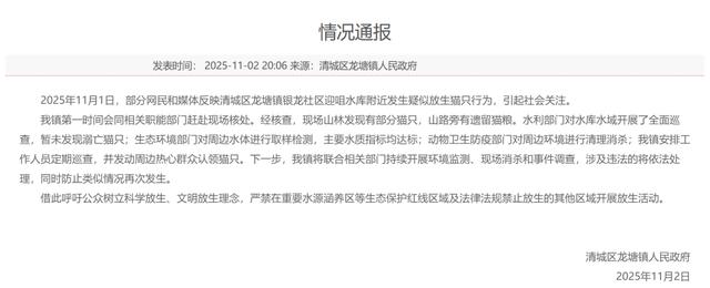 11月2日,清城区龙塘镇人民政府发布情况通报: 2025年11月1日,部分网民和媒体反映清城区龙塘镇银龙社区迎咀水库附近发生疑似放生猫只行为,引起社会关注。 我镇第一时间会同相关职能部门赶赴现场核处。经核查,现场山林发现有部分猫只,山路旁有遗留猫粮。水利部门对水库水域开展了全面巡查,暂未发现溺亡猫只;生态环境部门对周边水体进行取样检测,主要水质指标均达标;动物卫生防疫部门对周边环境进行清理消杀;我镇安排工作人员定期巡查,并发动周边热心群众认领猫只。下一步,我镇将联合相关部门持续开展环境监测、现场消杀和事件调查,涉及违法的将依法处理,同时防止类似情况再次发生。 借此呼吁公众树立科学放生、文明放生理念,严禁在重要水源涵养区等生态保护红线区域及法律法规禁止放生的其他区域开展放生活动。  此前据大皖新闻,11月1日,有市民在社交平台发布视频称,广东清远迎咀水库旁有一伙人放生大量猫咪。11月2日上午,大皖新闻记者就此事联系到迎咀水库管理所,值班工作人员回应称,昨晚管理所负责人已知晓此事,目前正前往现场查看情况,并联系其他部门进行处理。 来源:清城区龙塘镇人民政府 |