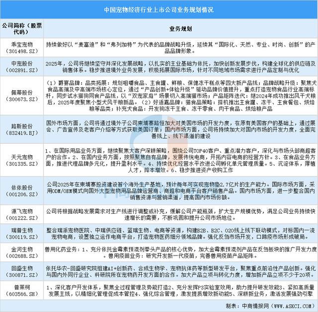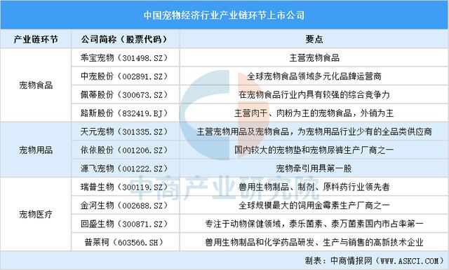 文 | 中商产业研究院 宠物经济是指围绕宠物的饲养、服务、消费等形成的一系列经济活动的总和,涵盖宠物从出生到死亡的全生命周期,涉及生产、销售、服务等多个环节,是随着人们宠物饲养需求增长和消费升级而兴起的新兴经济领域。 一、 中国宠物经济行业产业链环节上市公司整体情况宠物经济涉及众多行业,包括宠物食品、宠物用品和宠物医疗等。宠物食品行业上游为原材料供应环节,如粮食、肉类等,中游为宠物食品生产,下游是消费渠道。宠物用品上游为原材料,主要包括纺织品、板材、塑胶、橡胶、金属、绒毛浆、卫生纸、流延膜、高分子、膨润土等,中游为产品生产制造,包括宠物卫生用品、宠物美容用品、宠物训练用品、宠物玩具、宠物食用器皿、宠物配饰和服饰、宠物寝具用品、宠物旅行和户外用品等,下游为销售渠道。宠物医疗上游为医疗设备和医疗耗材供应环节,中游为医疗服务环节,下游为医疗平台或直接医疗服务直接面向消费者。 ![]() 资料来源:中商产业研究院整理 五、 中国宠物经济行业上市公司业务规划情况中国宠物经济行业上市公司业务规划聚焦多维度发展,涵盖品牌升级、市场拓展、产品创新、产能优化、资源整合、研发强化等,围绕产业链各环节,借策略升级适配市场需求、提升竞争力,推动行业进阶。 ![]() 资料来源:中商产业研究院整理 |