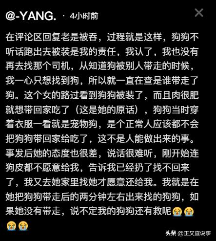 养了多年的宠物狗丢失,当找到时它已经被人宰杀好,还准备将它的肉吃掉,面对主人的质问,对方还冷血无情的说:“不就是一只狗,我捡到的我想怎样就怎样!” ![]() 在朋友不断宽慰下小杨回了家,她一晚上翻来覆去睡不着,担心胖虎的情况,好不容易熬到天亮了,小杨连忙跑到附近店铺,要求查看凌晨时段的监控,想通过监控,查看胖虎的去向。 周围店铺老板也都是好人,他们得知情况后,二话不说调出监控,帮忙翻找起来,这一找找到了6月5号,当天早上小杨一连看了好多个监控,才终于见到了胖虎的身影。 ![]() 女人在电话里告诉小杨:“我路过看见狗被撞死了,这狗又长得肉很肥,就想带回家吃了。” 小杨直接被这话吓呆了,可女人还在电话里自说自话,她表示已经将狗狗处理好了,小杨闻言崩溃了。 ![]() 小杨当即和女人起了争执,可女人却轻飘飘来了一句:“不就是一只狗吗?我捡到的东西想怎么处理就怎么处理。” 这样冷血无情的话,深深地伤害了小杨,她问女人索要胖虎的衣服以及其他残骸,可对方只回了句“已经扔了,找不回来了!”。 ![]() 小杨一番理论并没有任何用,最终她哭着抱胖虎离开了女人家,随即她联系了给宠物办葬礼的人,简单举行了一个仪式,便将胖虎火化了,小杨一边哭,一边抱着骨灰罐回了家。 当天晚上将近八点,小杨将这个事情发到网上,很快引起一些网友的注意,大家心疼小杨的同时,也可怜胖虎这条小生命的逝去。 ![]() 不少网友询问小杨后续打算,她仅表示不会放过对方,未详细说明维权计划。 有一些网友通过小杨公布的监控细节,找到了女人工作的足疗店,想要联系老板时,却发现电话已经打不通,联系店家无果后,有些过激的网友迁怒足疗店,到足疗店的账号下留差评。 ![]() 有网友为胖虎和小杨打抱不平,并劝小杨别伤心,也有网友埋怨小杨不看好胖虎,除此之外,还出现了一些令人难以理解的评论。 ![]() 有网友通过观看小杨的视频,就判断胖虎不足以装进视频中的纸箱,便质疑小杨想要起号,更有网友对处理过程进行不当的想象和描述。 ![]() 6月6号早上,小杨在自己的社交账号上发文,表示自己知道是她的疏忽导致胖虎被撞,她知道自己错了,所以并没有因此找司机的麻烦,她只是接受不了胖虎落得如此悲惨的结局。 据小杨说,在女人把胖虎带走两分钟左右,她便已经在找狗了,也因此小杨觉得如果女人没有带走胖虎,说不定它还有救。 ![]() 况且,一只有主的狗躺地上,第一反应是把它回家吃掉,这在小杨看来根本就不是人能做出来的事情。 再加上,整个沟通过程中,对方态度很差,说话也难听,这才选择将此事曝光,目前,小杨也正在通过法律手段为胖虎讨公道。 ![]() 小杨选择通过曝光寻求正义和宣泄情绪,想要获得网友心理上的支持,也是一种方法,但一些网友过分苛责小杨,只会让她受到二次伤害。 每个生命都值得被尊重,不应受到漠视,宠物对于主人来说,不止是“陪伴者”,更是不可替代的家人,希望类似事件不会再发生,也希望小杨能早日走出伤痛。 来源: 抖音@-YANG. 所发内容 ![]() |
