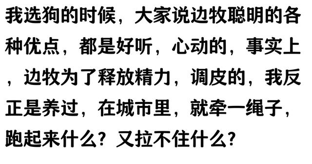 ![]() 01 ![]() 04 边牧实行高智商的行为模式,但日常打理起来做起来颇为麻烦。作为一个养边牧的人,我在训练边牧了好几种技能,训练过程差点崩溃。我建议想养边牧的人让自己有足够心理准备,不然可能会后悔。 05 ![]() 06 有一个朋友,之前一直想养边牧一起玩耍,现在养了才发现麻烦不少。但是边牧的聪明劲都用在和他斗智斗勇上,我就觉得从它服从性不高这点就很让人头疼。有时候带它一出去遛,遛它半天的精力没白费,它倒是玩得什么都不顾了。 07 ![]() 10 有一次我朋友和他养的边牧跟我去公园玩,另外他家小孩在草地上逗边牧的玩具,我刚坐下就听到:什么?那边牧冲我一通叫,突然朋友大声说:我没拉住,我这一不留神它就是冲过去了。小孩都吓哭了,我也不知道咋安抚,也不明白那边牧究竟为啥突然这样,唉。 11 ![]() 12 那年我们想着养只狗,一个朋友推荐了边牧在网上看了好多视频,心动了想买吧,非要跟风,一冲动就买了只不了解习性,养了。后来发现家里到处有被破坏的痕迹,它精力在旺盛呢,根本消耗不完的活力到处去,把家里搞得乱七八糟了,咬坏了好多东西,最后成了个麻烦的主子,我又花了好多心思把它训练好。 13 ![]() 14 我家那只边牧的精力,真的旺盛得我的老腰也跟着一起遭罪,我有时候可能是后悔养了,看见人家养的温顺小狗一起在那晒太阳他精力过剩的折腾:哎!别跑了!我那会儿真无奈! 15 ![]() 18 我养边牧与它相处已有些时日,未觉它有啥不好,本以为聪明就是养狗的优势。然而,事实并非如此,它太聪明有了自己想法。它精力旺盛,人和它之间互动太累,热情渐淡,关系如今已有些疏远。它想法太多,若在城市或小院,稍有疏忽都能制造麻烦。我无奈,它太活跃,养它仅带来短暂欢乐,而这欢乐也是建立在我疲于应付之上,养之不易。它还总是在调皮与乖巧间切换,而我在无奈中坚持。 19 ![]() 20 我之前那邻居把边牧养小区里,说:这狗可聪明了,我一开始挺好奇,然后看那狗天天上蹿下跳,精力旺盛的模样,我都惊了,就寻思在小区养合适吧,我没养过就试着逗它玩了,接着它就兴奋得不行,过一会儿又跑又跳了,而且还爱咬东西,那主人我看管都管不住还累得够呛,遛了半天了主人,我就跟邻居聊,我问他为啥养来着,说:别人送的,养了一段时间后受不了了,就转手给别人了,可算摆脱了,我就感慨这狗不好养啊 大家对这件事怎么看? 欢迎在评论区留言讨论。 |