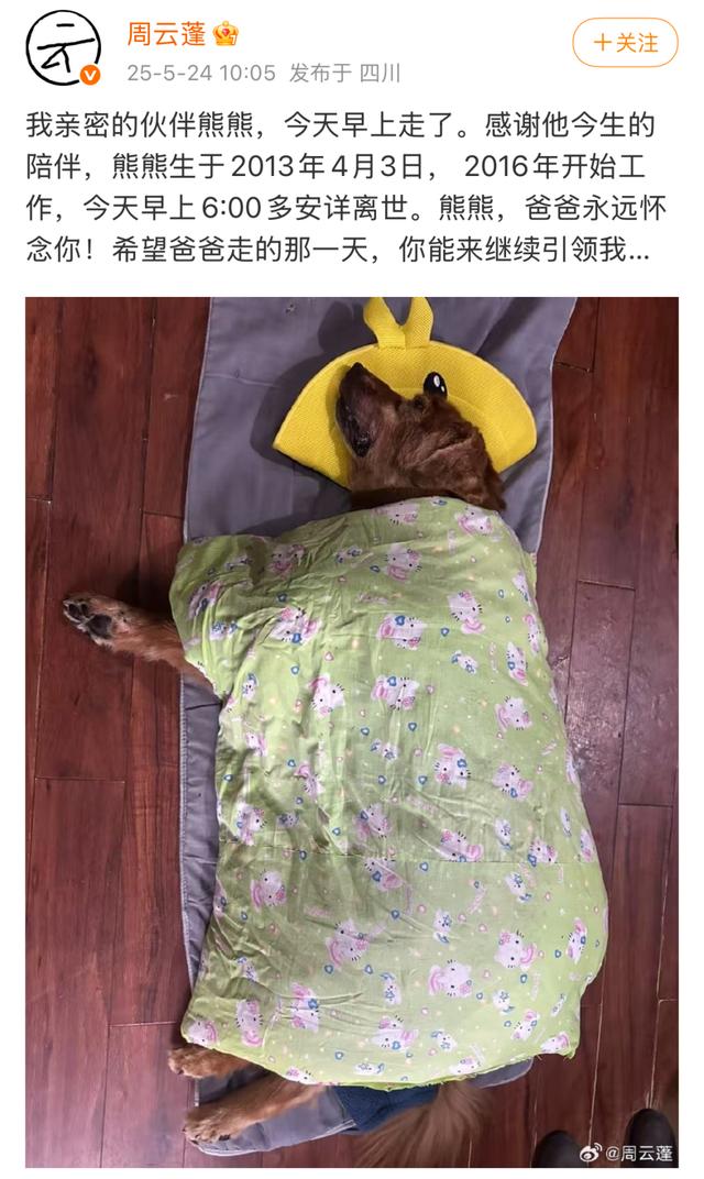 一条温暖湿润的大舌头卷走了周云蓬手心里的狗粮,它是熊熊,一只漂亮的酒红色美式金毛,这是导盲犬基地特意为周云蓬挑选的。“他们听说我是歌手经常上台演出,就说给我挑一只颜值高的。”在舞台的黑暗中,熊熊光亮的长毛显眼又美丽。 5月29日,民谣歌手周云蓬匆匆结束在台北和京都两个城市的行程,赶回大理给去世的导盲犬熊熊过“头七”。 在大理的清晨,阳光曾无数次洒在周云蓬和导盲犬熊熊的身上,而如今,这个画面永远定格在了回忆里。5月24日,周云蓬的导盲犬熊熊离世。电话那头,周云蓬低沉的声音里,满是对这位相伴9年的家人的深切怀念。 熊熊去世那一天,周云蓬在外旅行。周云蓬很少觉得孤独,但那几天,他经常控制不住自己的情绪。晚上在西门町酒吧喝酒,想起熊熊,他忍不住在陌生环境中泪如泉涌,直到有人递给他一沓纸巾。在台北街头,车水马龙,人潮汹涌,他不由得想起从前面对这种情况,熊熊可以带着他绕过障碍,抵达终点。 周围的热闹映衬得心中的痛苦更深了,周云蓬冲动地“想对着这风花雪月、五颜六色、灯红酒绿的街道,对着人群呼喊”:“我的狗狗去世了,我很难过。我曾经有一只狗,我很爱他,他也很爱我。” ![]() ![]() 熊熊陪周云蓬演出。 家人 熊熊去世后,周云蓬感到心里“空落落”的。其实这一年多来,随着熊熊进入老年,身体亮起红灯,他已经很少带熊熊出门。熊熊已经不再是他的“眼睛”,但那份情感的羁绊反而更深了,熊熊早已成了他的家人。 周云蓬和熊熊有很多只有彼此知道的亲密时刻。当他在家中独自弹吉他时,熊熊有时候会走过来,用毛茸茸的脑袋拱拱他的手,好像在说,“别弹琴了,陪我玩吧。”平时,熊熊也喜欢把脑袋靠在周云蓬腿上撒娇,“求抚摸”。 ![]() 熊熊听周云蓬弹琴。 导盲犬有自己的“工作时间”和“自由时间”,当戴上导盲鞍,导盲犬就自动进入工作时间,这时他将一切以主人为优先,保护主人,引导主人。 周云蓬带熊熊出门找朋友吃饭,或是坐飞机出门,熊熊都处于工作时间。饭店里香味飘散,熊熊趴在桌下什么都不能吃,周云蓬就忍不住心疼熊熊,觉得他太辛苦了。 坐飞机的时候,为了避免导盲犬在飞机上需要上厕所,熊熊从前一天晚上就要开始禁食禁水。飞机上开始发放餐食时,熊熊虽然知道自己不能吃,还是忍不住探出头,看看空姐发的是牛肉饭还是猪排饭,使劲嗅嗅空气中的味道。 后来,周云蓬干脆自己也拒绝盒饭,“我觉得熊熊饿着,我也可以饿着。熊熊最大的爱好就是吃东西,但他能忍住,这时候我在他面前吃东西,我觉得太残忍了。” 周云蓬带熊熊出门,有时候是自己工作,有时候也是为了熊熊。他经常想,熊熊应该喜欢在海边玩,应该喜欢到草原上奔跑,于是这些地方都被列入旅行清单,但他没带熊熊去过西藏,因为熊熊有高原反应。现在回想起来,他还在遗憾,没能带熊熊出国一次。 他经常揣摩熊熊在想什么,熊熊工作时,他为熊熊骄傲,又忍不住想,这是不是违反了狗的天性。有一次在阿那亚,周云蓬和熊熊遇到了一只熊熊以前在基地的“同学”。“同学”因为性格太活泼,没法安静地工作,早早退役,被一家人收养,过上了宠物犬的美好生活。周云蓬猜熊熊也许很羡慕那只狗,“学渣反而过得更好。” 他也希望熊熊能过得好。熊熊退役后,他请了大理当地“宠物托儿所”一位叫“麻辣烫”的女孩照顾熊熊,每天早晚各一小时,散步、洗澡、梳毛。当他不在大理时,经常询问“麻辣烫”熊熊的现状,听到熊熊见义勇为打败了小区里欺负小狗的大狗,他就开心不已。 ![]() 周云蓬和熊熊 “导盲犬是工作犬,是带着视障人士走路的,拒绝它等于拒绝一部分视障人士。导盲犬工作很辛苦,值得尊重。”周云蓬呼吁,希望公共场所能遵守国家相关规定接纳导盲犬。 他经常带着熊熊出席公众场合,参加综艺、演唱会,希望通过熊熊的曝光,让更多人了解导盲犬,“我是一个公众人物,遇到不平还能发声,大部分视障人群和导盲犬只能承受。” “导盲犬遇到的困境,很大程度上是因为导盲犬数量太少了。” 熊熊和周云蓬的共同训练师王鑫说。接回熊熊近10年,周云蓬依然与王鑫保持联系,有关于导盲犬身体健康和使用的任何问题,他都可以随时咨询。 目前,中国在役的导盲犬有400多只,而根据中国盲人协会统计数据显示,中国约有1700万盲人 。中国导盲犬大连培训基地是中国残联认证的唯一一家机构,中国在役导盲犬中,有近300只出自于此。 从种犬繁育、性格评估,到适应复杂环境,每一只导盲犬都要经过严格筛选和漫长训练。王鑫介绍,以熊熊为例,它是捐赠而来,经过全方位体检、性格评估后,才踏上成为导盲犬的道路。培养一只导盲犬成本高昂、难度巨大,中国复杂的交通环境,让导盲犬的训练时间比国外更长,从一岁开始技能训练,到真正上岗需要一年半左右。 领养一只导盲犬完全免费,而基地培养一只导盲犬的费用是197800元。尽管有财政补贴,基地面临的压力依然巨大。王鑫说,基地里的训导师和训导员大都是宠物、兽医相关专业出身,学历都不低,却大都只能拿一份微薄工资,凭着热爱坚持。 目前,王鑫的通讯录里有200多位导盲犬主人,每一位都是她亲自带出来的。王鑫学的是心理专业,已经在基地坚持了16年。她的妈妈是视障人士,申请到导盲犬后,生活发生了巨大的正向改变,这让王鑫对这个行业产生了兴趣。作为训导