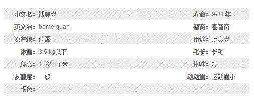 寿 命:大约15年 犬 种:博美 别 名:波美拉尼亚犬 松鼠犬 博美犬 英文名:Pomeranian FCI分组:尖嘴犬和原始犬种组 体型分类:小型犬 AKC分组:玩具犬 现在用途:玩赏犬 家庭伴侣犬 最初用途:玩赏犬 适应居住环境:适合居住在城市公寓里。 认证俱乐部:CKC AKC UKC KCGB CKU ANKC NKC NZKC CCR APRI ACR
