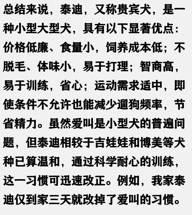 刷到是缘分,感谢大家的阅读,希望您能动动小手帮忙点赞,关注,评论。你的支持和鼓励是我前进的动力。在此祝福大家天天快乐,日日开心! r01 r r02 r我还真没见过乱叫的泰迪,我的初衷是养只大狗,后面感觉不行,吃的多拉的多,洗澡也费钱掉毛严重体味重,流口水想想带它出门要捡狗屎,那么大的狗拉一次一把抓不完想想都上头r还是养个小体型的吧,出门好携带吃得少拉的少狗屎两张纸巾就捡了,自己在家也能给它洗澡,运动量也小,后期费用不大 r03 r r08 r嘿嘿 我家的 11岁了 从两个月开始养的r就是个贼娃子但从来没有抱着人的腿或者对空气那样的 从没有 也不爱乱叫r就有时候楼道声音大的话会叫 邻居都说他很安静 平时都听不到声音 r09 r r14 r网上对泰迪的偏见很大,但我不养泰迪,身边却有众多养泰迪的朋友。对比之下,我发现泰迪非常聪明,能看懂人的脸色,具备极强的通灵性。它们依赖主人,忠诚度高,对主人来说,养泰迪就像多了个小棉袄,不操心也不闹心,而且泰迪不掉毛,无异味,即便不常美容也不至于难看。然而,这种狗也有缺点:它们会狗仗人势,因为体型小,声势却很大,看见别的狗就乱叫,但一旦主人不在身边,就会夹着尾巴,不敢吭声。 r15 r r18 r我的泰迪爱干净,不掉毛,自己养成的习惯好,大小便自己必须到室外解决 r大家对这件事怎么看? r欢迎在评论区留言讨论。 |