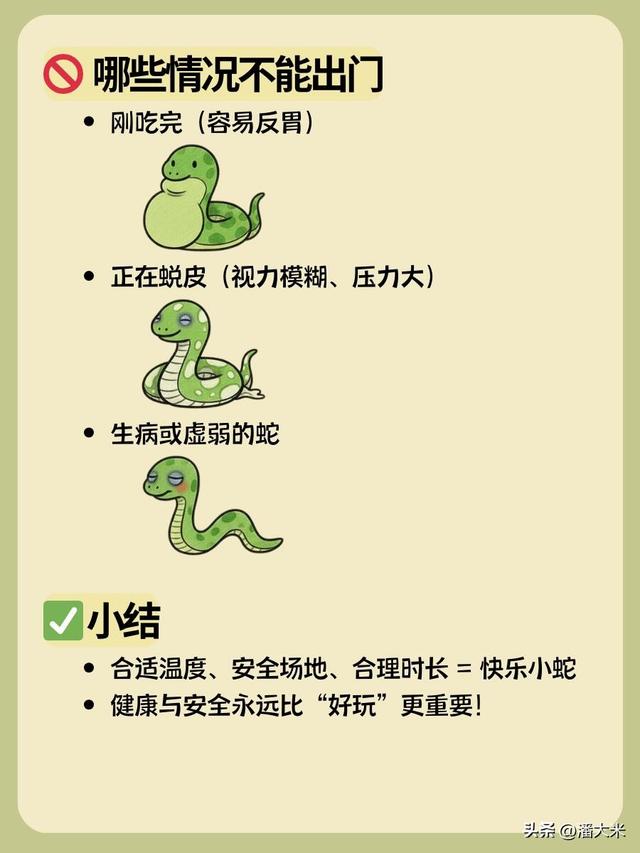 带蛇出门核心是“安全优先”:刚吃完、蜕皮期别出门,发现它盘绕防御、频繁吐舌就要立刻返程。你养的是什么品种的宠物蛇?评论区聊聊你平时怎么照顾它吧!