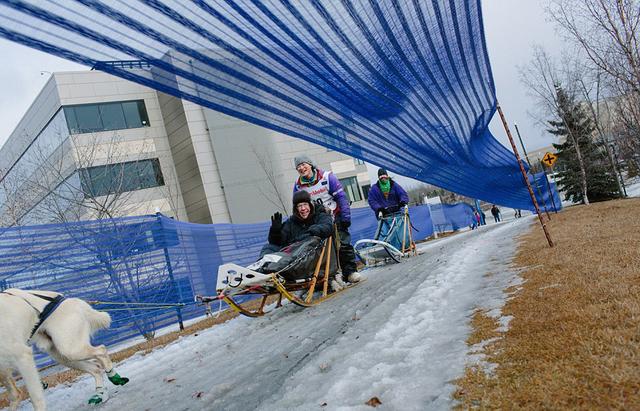 去年狗拉雪橇比赛中,尽管安克雷奇赛道上积雪有限,但至少还能进行比赛。(网页截图)
