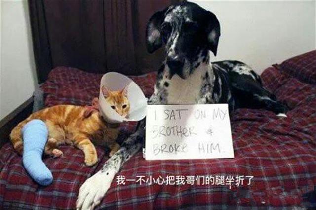 这只斑点狗太坏了吧,居然欺负铲屎官最心爱的猫咪。感觉这狗就是故意的,故意把橘猫的腿坐折了。就是为了得到铲屎官的宠爱,结果自己太蠢被发现了,还被主人挂牌了,宣告天下。