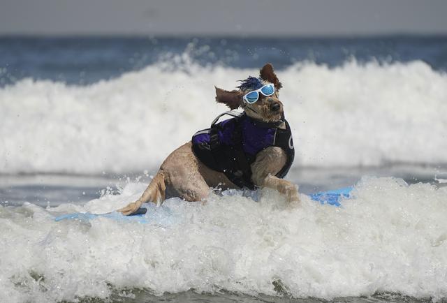 8月3日,参赛犬在美国加利福尼亚州帕西菲卡举行的狗狗冲浪比赛上乘风破浪。