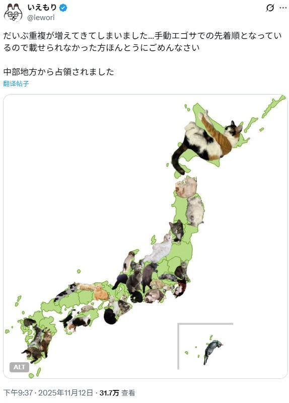 众所周知,喵星人都是液体做的,可以轻松凹成各种造型。 每家铲屎官的手机里,估计满满都是喵星人的可爱照片和视频,每一刻都让人忍不住想分享给全世界。 日本铲屎官@iewori的家里,养了一只1岁母猫。 近日,铲屎官闲来无事撸撸猫,给喵星人拍了张照片。 ![]() (截图来自日本网友@iewori) “比我想象的还要合适……?” ![]() (截图来自日本网友@iewori) 这才一个星期,点赞数就超过10万,网友们觉得还挺可爱: “我上小学的时候,老师说茨城县的形状像猫,这是真的。” ![]() (截图来自日本网友@mrmrtoumrks) “诶,想吸茨城县。” ![]() (截图来自日本网友评论@userqz8) “我来当秋田县。” ![]() (截图来自日本网友评论@half_straycat) “宫城县。” ![]() (截图来自日本网友评论@imojin8) ![]() (截图来自日本网友@iewori) “现在大家投稿重复的地区很多……对于那些未能被收录的人,我深表歉意,因为这是按照先后顺序进行的。” (截图来自日本网友@iewori) ![]() “这是重新调整后的版本,以及无背景版本。” ![]() (截图来自日本网友@iewori) 日本网友表示,希望把无背景版本的“猫咪地图”印在T恤上。 ![]() (无背景版本) 果然喵星人就是超可爱的 |