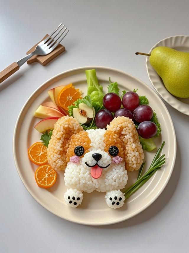 ![]() ![]() ![]() ![]() 食材准备米饭、海苔、火腿、小番茄(或其他红色可食用小食材)、橙子、苹果、葡萄、生菜、西芹、迷迭香 。 制作步骤头部塑形将部分米饭混合橙色食材(如胡萝卜泥等)揉成耳朵形状,白色米饭揉成脸部形状,组合成头部,放置在盘子中央 。五官制作用海苔剪出圆形做眼睛,内部填充黑豆或其他黑色小食材做眼珠。海苔剪出小三角形做鼻子,火腿剪出舌头形状。小番茄切片或取粉色食材做腮红,贴在脸部两侧。四肢制作:取白色米饭揉成四肢形状,用海苔剪出爪印形状贴在上面,摆放在头部下方合适位置。装饰摆盘橙子、苹果切片,葡萄、生菜、西芹、迷迭香等摆放在盘子空余位置,围绕蝴蝶犬饭团,丰富整体造型。 |