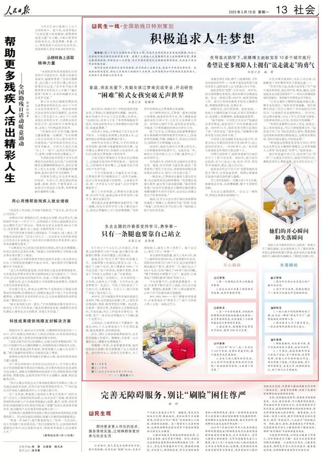 第三十五个全国助残日到来之际,习近平总书记作出重要指示强调,残疾人是推进中国式现代化的重要力量。希望广大残疾人从自强模范身上汲取精神力量,勇敢克服困难挑战,积极追求人生梦想,为以中国式现代化全面推进强国建设、民族复兴伟业作出积极贡献。 面对身体的不便和生活中的困难,很多残疾人自强不息,在奋斗中书写生命华章。本版推出特别策划,讲述几位残疾人的精彩人生故事,也希望探寻如何更好地关爱残疾人、让残疾人更好融入社会生活。 家庭、师友关爱下, 失聪女孩江梦南完成学业、开启研究“困难”模式女孩突破无声世界 人民日报记者 窦瀚洋 ![]() 赵秋宝和他的导盲犬阿尔法。图片为受访者提供 身着豆绿色T恤,脖子上挂着相机,不时发出爽朗的笑声……如果不是身边形影不离的导盲犬,赵秋宝看上去与普通人并无不同。 赵秋宝网名“宝哥”,今年43岁。2017年,因为视网膜色素变性,他的双眼仅存微弱光感。经过一段低谷期,2019年,赵秋宝恢复工作。他可以利用电脑和手机的无障碍功能,便捷地获取信息、处理业务。 相较而言,出行更困难。赵秋宝说,一些地方无障碍设施不完善,红绿灯没有提示音,或者路上有障碍物,走路磕碰是常事。 “能不能领一只导盲犬当向导?”抱着试试看的想法,赵秋宝向广州市残联递交申请。2019年11月,他将导盲犬阿尔法领回了家。“我很幸运。”赵秋宝说,“视障朋友拥有导盲犬的比例并不高。” 中国盲人协会副秘书长赵公政介绍,目前全国正在服役的导盲犬有300多只,加上退役的导盲犬,一共600多只,而一些导盲犬基地报名申领的人数达数千人。 在阿尔法陪伴下,赵秋宝逐渐可以独自步行上下班乃至出差。2023年,他开始外出旅游,至今已走过上海、杭州、苏州、青岛等17座城市,最近,他正在北京。 赵秋宝在抖音平台开设“宝哥和他的导盲犬”账号,分享旅途见闻。视频记录着他在旅途中感受到的爱与温暖: 在三亚的美食街,一位摊主放下手头生意,领着他逛市场,品尝糟粕醋、椰子水等特色美食; 在北京五道营胡同,一位女士一路陪同,带他去稻香村选购特产; 在长沙乘坐地铁时,市民主动让座,还提醒他下车时哪里有柱子需要注意…… “你看不见大海,但是大海看见了你”“他只是没有视觉,他还有听觉、嗅觉、触觉,这些加起来也会感受到美好”……网友们热情地给赵秋宝留言。他的账号目前有近百万粉丝。 “公共交通的无障碍设施越来越完备,服务也很到位。”赵秋宝深有感触。他在视频中讲述了自己日常在广州坐地铁出行的经历,“从地铁区庄站到板桥站,一共17站,经过两次换乘,10位工作人员的接力帮助、无数乘客的热心引导,我的出行很顺畅。” “我现在拿着阿尔法的工作证、免疫证,加上我的残疾证,可以方便地搭乘火车。”赵秋宝介绍,“坐飞机却没那么便利,需要到指定检疫机构获取动物检疫证,证明有效期很短,有时回程还得去开检疫证明。” “希望通过视频普及导盲犬知识,呼吁社会各界关注无障碍环境建设,让更多视障人士拥有‘说走就走’的勇气。”赵秋宝说。 他计划走遍中国之后,走出国门去“看一看”,“去遇见不同的人,体验不同的生活,激励更多的人勇敢追梦,成为更好的自己。” 失去左腿的许春香 坚持学习,勇争第一只有一条腿也要靠自己站立 人民日报记者 王伟健 ![]() 许春香。图片为受访者提供 5月15日下午4点半,江苏宿迁,许春香正面带微笑与客户沟通,她头戴耳麦,眼睛紧盯屏幕,手指在键盘上灵活跳动。 她是京东“阳光天使”团队的客服人员。电脑屏幕上的通话记录显示,这一天,她打了238个电话,客户满意率100%。“今天还受到了客户的表扬,有额外奖励,看来这个月的收入还得往上涨。”许春香说。 许春香是一位残疾人。11岁那年的一次车祸,让她失去了左腿。大专毕业后,她曾梦想当一名会计。可找工作时面试了十几家公司,全都落选。无奈之下,她只好进厂当起了流水线工人。 2019年,在外地漂泊多年的她回到宿迁老家结了婚,还找到这份客服工作,主要负责处理退款、维修、换货等售后问题。但此前,许春香一直很自卑,见到陌生人总躲得远远的,不善沟通,所以工作起来非常吃力。有时候,客户一连在电话里抛出几个问题,她一个也答不上。 正因如此,许春香的客户不满意率一度高达30%,个人业绩连续3个月在团队垫底,她急得直哭,害怕被辞退。 好在,团队主管鼓励她勇敢面对,还手把手教她工作技巧。慢慢地,许春香一点点重拾信心,满意率也慢慢提升。 结婚刚一年多,许春香遭遇家暴,她向法院起诉离婚,努力争取到了女儿的抚养权。独自抚养女儿,经济压力非常大,为了增加收入,她在工作上更拼了。她下定决心,要在工作上“争第一”。 首先要拼的是数量,每天上班8小时,除了上厕所和吃饭的时间,许春香都在打电话。同组的伙伴每天打120个左右,但许春香每天都远超这个数字,最多的一天,她打出去了432个电话,为用户解决了400多个售后问题,“嗓子疼到凉水都喝不下去”。就这样,许春香成了同事们眼里“最拼”的那个人。 可光有量不行,还得提高满意率。为此,许春香不断向老员工请教,自己也反复琢磨。慢慢地,她掌握了窍门:要注重细节,让客户在不经意间感受到温暖。 90%、92%、96%……客户满意率持续提升,许春香成长为“明星员工”,每个月的收入算上五险一金能过