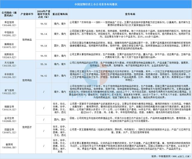 文 | 中商产业研究院 宠物经济是指围绕宠物的饲养、服务、消费等形成的一系列经济活动的总和,涵盖宠物从出生到死亡的全生命周期,涉及生产、销售、服务等多个环节,是随着人们宠物饲养需求增长和消费升级而兴起的新兴经济领域。 一、 中国宠物经济行业产业链环节上市公司整体情况宠物经济涉及众多行业,包括宠物食品、宠物用品和宠物医疗等。宠物食品行业上游为原材料供应环节,如粮食、肉类等,中游为宠物食品生产,下游是消费渠道。宠物用品上游为原材料,主要包括纺织品、板材、塑胶、橡胶、金属、绒毛浆、卫生纸、流延膜、高分子、膨润土等,中游为产品生产制造,包括宠物卫生用品、宠物美容用品、宠物训练用品、宠物玩具、宠物食用器皿、宠物配饰和服饰、宠物寝具用品、宠物旅行和户外用品等,下游为销售渠道。宠物医疗上游为医疗设备和医疗耗材供应环节,中游为医疗服务环节,下游为医疗平台或直接医疗服务直接面向消费者。 ![]() 资料来源:中商产业研究院整理 代表性企业有乖宝宠物、天元宠物、瑞普生物等。 ![]() 资料来源:中商产业研究院整理 二、 中国宠物经济行业上市公司区域分布情况宠物经济行业重点上市公司分布不均,呈现明显的区域集中特征。山东、浙江等省份的相关上市公司数量相对较多,而部分省份(如西部、北部一些地区)则较少甚至没有。 ![]() 资料来源:中商产业研究院整理 三、 中国宠物经济行业上市公司经营情况对比分析2024年中国宠物经济行业上市公司多数实现营收增长,宠物食品类企业表现突出,宠物用品企业增速较快,仅普莱柯营收负增长。 ![]() 数据来源:中商产业研究院整理 四、 中国宠物经济行业上市公司业务布局情况中国宠物经济上市公司业务布局呈现出宠物食品类公司聚焦细分产品、业务占比高,宠物用品类公司产品多元、布局境内外,宠物医疗类公司覆盖多区域、业务综合且各环节企业在产业链深耕、区域布局广泛但各有侧重的特点。 ![]() 资料来源:中商产业研究院整理 五、 中国宠物经济行业上市公司业务规划情况中国宠物经济行业上市公司业务规划聚焦多维度发展,涵盖品牌升级、市场拓展、产品创新、产能优化、资源整合、研发强化等,围绕产业链各环节,借策略升级适配市场需求、提升竞争力,推动行业进阶。 ![]() 资料来源:中商产业研究院整理 |