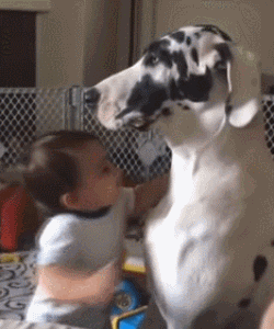 关于大丹还有一个重要情报,那就是它们自带反差萌。大丹虽然外表非常高大威武,但是性格上却是那种特别温柔的好脾气,无论是对主人还是陌生人,甚至其他小动物,大丹犬都是非常友好的,所以它们的外号是“温柔的巨人(Gentle giant)”。