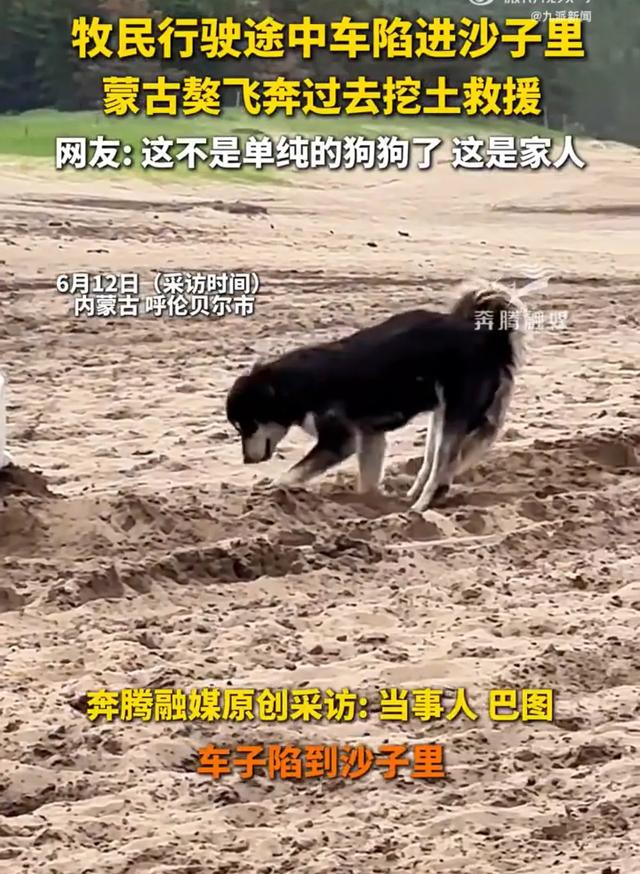 6月12日(采访),内蒙古呼伦贝尔市。一位牧民行驶途中车陷进沙子里,家里的狗蒙古獒飞奔过去挖土救援。当事人巴图告诉记者,看到之后特别感动。狗狗今年2岁了,平常就特别聪明。(九派新闻)