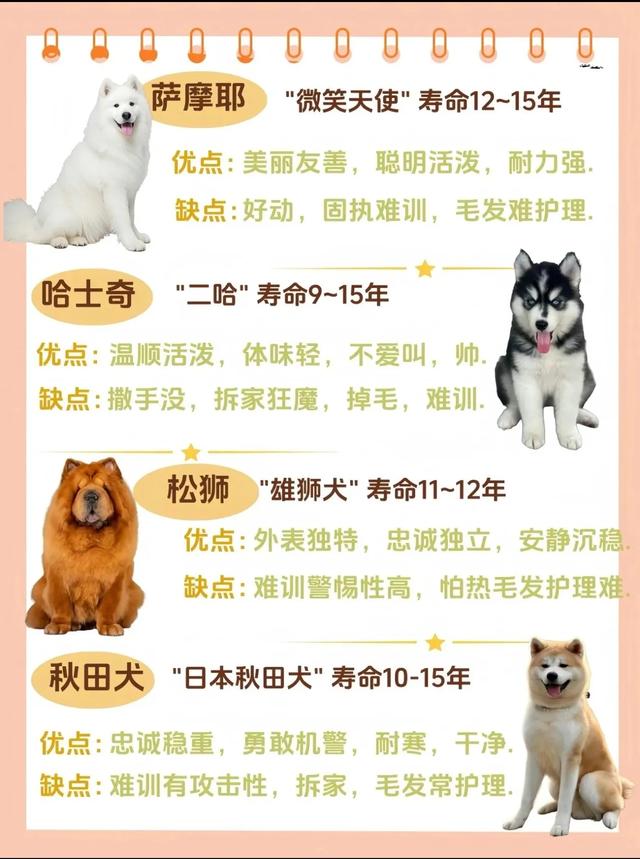 ✅中华田园犬:体质好、通人性,忠诚度爆表~❌ 颜值较随机(但土狗也超可爱!) ✅萨摩耶:微笑天使,颜值治愈~❌ 掉毛怪 容易有泪痕 ✅哈士奇:拆迁大队长,快乐修勾~❌ 服从性差,撒手没专业户 ✅松狮犬:憨厚 “熊样”,性格独立~❌ 体味重、流口水,运动后更明显 ✅秋田犬:忠犬八公同款,威严稳重~❌ 性格倔强,对陌生人警惕