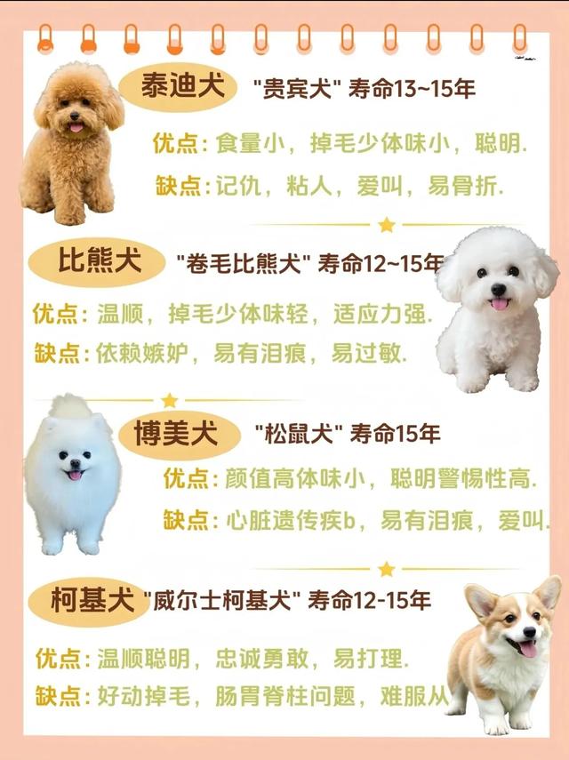 ✅泰迪:聪明粘人、体味小,造型百变超可爱~❌ 容易有泪痕、爱叫爱挑衅 ✅比熊:棉花糖颜值、性格温顺,治愈力拉满!❌ 要频繁打理毛发,易脏 ✅博美:毛茸茸像小团子,活泼又警觉~❌ 脾气有点小傲娇,骨骼较脆弱 ✅柯基:小短腿大屁股,性格稳重亲人~❌ 掉毛怪 容易腰椎问题 ✅吉娃娃:迷你体型好饲养,忠诚度高~❌ 敏感爱叫,对陌生人警惕