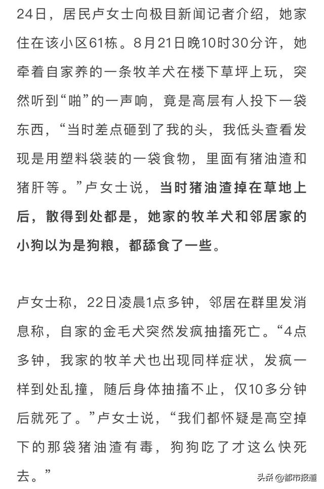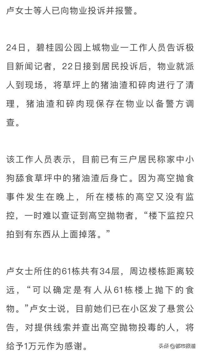 近日,广西崇左市碧桂园公园上城小区发生一起高空抛食事件,多条小狗误食后身亡。8月24日,极目新闻记者从崇左市公安局城南派出所获悉,目前警方已立案,正在调查。