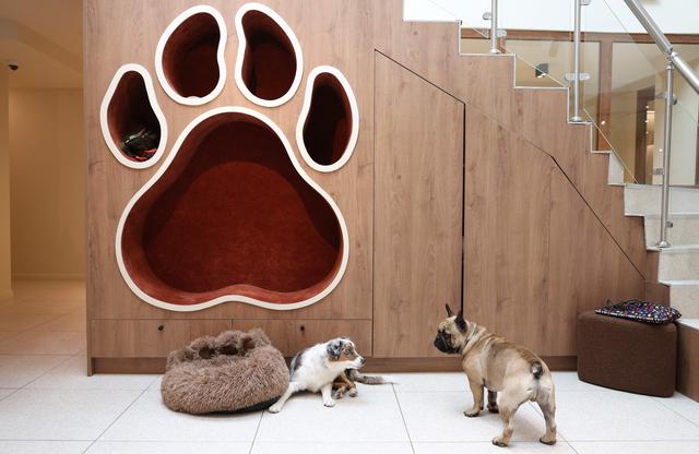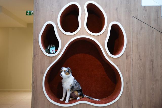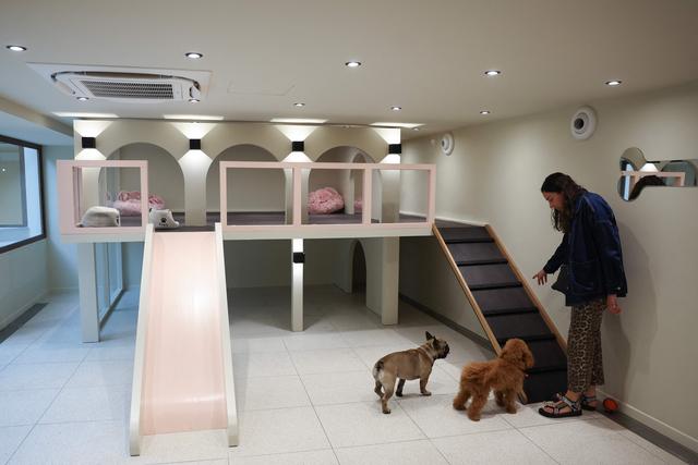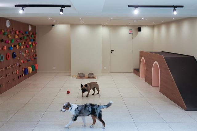 8月26日,狗主人与爱犬在法国巴黎一家犬类社交俱乐部里互动。新华社/法新