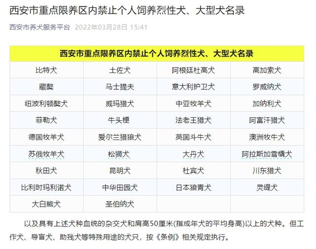 记者 | 曾永红 近日,“中华田园犬禁养”登上了微博热搜,引发网友的广泛关注和讨论。有网友对此表示不理解,发表自己的看法“老祖宗严选,为什么不让养”“田园犬体型也不大,为什么要列为禁养犬?” ![]() △微博热搜及对应配图。 在这份名单中,有萨摩耶、中华田园犬、秋田犬等大家熟知的犬种,不少网友的关注点是,这些犬种在大家印象中较为温顺。也有网友称:“你认为中华田园犬温顺?那是在主人面前,对待陌生人,凶得很。” ![]() 7月1日,潇湘晨报记者分别向西安市公安、城管等部门进行求证和了解。 西安市城管局工作人员表示,目前西安市实施的是《西安市限制养犬条例》,该办法从2012年2月1日开始实施。记者从西安市人民政府网站上找到了该条例。 ![]() △西安市限制养犬条例。来源于西安市政府官网。 从西安市城管局的官网上可以看到文明养犬的相关宣传:活动中,执法人员依据职责和工作实际,向居民发放《致全市广大养犬者的一封信》《西安市限制养犬条例》等宣传资料,并详细讲解养犬人外出遛犬、犬只随地便溺不清理影响市容环境卫生的相关法律法规知识,同时,向居民普及了文明养犬及狂犬病防控科学知识,号召居民定期为犬只注射疫苗和体检,携犬外出时要拴绳,及时清理粪便,遇到老人、小孩、孕妇应主动避让,引导居民养成依法养犬、规范养犬、文明养犬行为习惯,共同打造文明有序的城市环境。 西安市公安局碑林分局限制养犬管理办公室工作人员告诉记者,目前辖区内的犬只管理依据的是《西安市限制养犬条例》,在西安市养犬服务平台上,可以看到具体的禁养烈性犬、大型犬名录。 该工作人员表示,中华田园犬一直在禁养名单里,而依据“肩高超过50厘米”的规定,萨摩耶也属于禁养犬。 ![]() △西安市重点限养区内禁止个人饲养烈性犬、大型犬名录 具体的限养区也有明确规定: 1、西安市实行划区域限制养犬。三环路以内区域及三环路以外的城镇居民居住区、机关、企业事业单位、学校、幼儿园、医院、文物古迹保护区、风景名胜游览区等区域为重点限养区;其他区域为一般限养区。 2、个人申请养犬符合条件的,重点限养区内每户限养一只;一般限养区内每户养犬不得超过两只。重点限养区内禁止个人饲养烈性犬、大型犬。 单位饲养或者一般限养区内个人饲养烈性犬、大型犬的,必须实行拴养或者圈养。 作者:曾永红 来源: 潇湘晨报 |