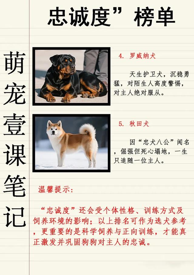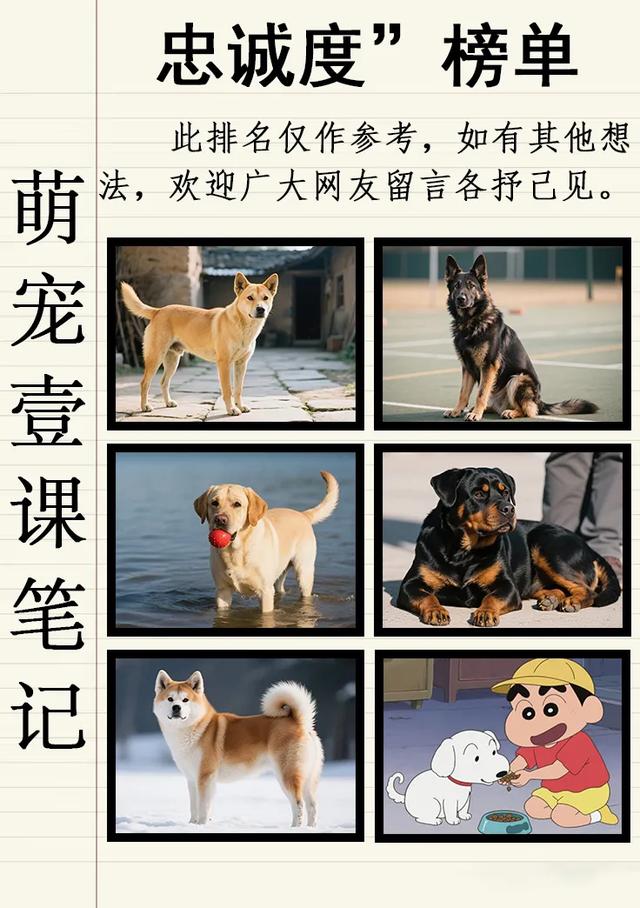 1. 中华田园犬(土狗) 被几乎所有榜单推为“忠诚度第一”,看家护主、一生只认一位主人。 2. 德国牧羊犬 警犬、军犬首选,服从性与保护欲极强,可为护主拼命。 3. 拉布拉多寻回犬 导盲犬“专业户”,温顺又极度粘人,对孩子和主人都极有耐心。 4. 罗威纳犬 天生护卫犬,沉稳勇猛,对陌生人高度警惕,对主人绝对服从。 5. 秋田犬 因“忠犬八公”闻名,倔强但死心塌地,一生只追随一位主人。 温馨提示 “忠诚度”还会受个体性格、训练方式及饲养环境的影响;以上排名可作为选犬参考,更重要的是科学饲养与正向训练,才能真正激发并巩固狗狗对主人的忠诚。#狗狗##宠物##狗狗是人类忠实的朋友,爱狗的友友都喜欢什么类型的狗狗?# ![]() ![]() |