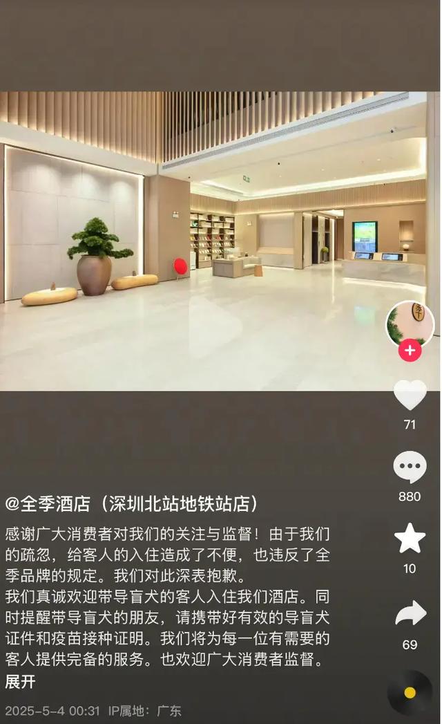 近日,视障博主@诺子喵呜在社交平台发视频称,其携带导盲犬入住全季酒店(深圳北站地铁站店)时遭拒。尽管博主已提前完成线上预订并多次电话沟通,酒店仍以“无相关接待机制”为由拒绝办理入住。 据悉,博主@诺子喵呜是一名全职主播,在B站拥有188万粉丝。她因神经系统罕见病后天失明,是一级视力障碍和三级肢体障碍的残障人士。  视障博主@诺子喵呜(图源:微博) 据@诺子喵呜视频内容,此次系她首次来到深圳,专程为参加“世界孤独症日”活动,计划与由孤独症青年组成的爱特乐团进行交流。鉴于活动地点位于深圳北站周边,该博主提前预订了附近的全季酒店客房。 此前,该博主曾携导盲犬成功入住全季酒店位于上海、北京的门店,基于过往的良好体验,此次仍选择入住该品牌酒店。入住前,她曾多次致电酒店,试图确认携带导盲犬入住的相关事宜,但始终未能获得明确答复。 由于不能线上退款,博主希望当面沟通后能够解决问题,并出示了自己的残疾人证和导盲犬证。然而经过前台工作人员与酒店管理层的多次协商,酒店方面最终以“无相关接待机制”为由,拒绝为博主及其导盲犬办理入住手续。在此过程中,博主被迫在酒店大堂等候三个多小时。 最终,在警方及酒店前台的协调下,博主被安排至附近其他酒店入住。  涉事酒店致歉 针对此事,现代快报记者联系了华住会,相关负责人回应称,集团要求旗下酒店严格遵守法律规定,允许持有效导盲犬证件及疫苗证明的视障人士入住。涉事酒店的行为已违反品牌规定。同时,涉事酒店已经通过其抖音账号发布致歉声明,后续将和当事人取得联系并沟通致歉。 记者查询《深圳经济特区无障碍城市建设条例》发现,该条例第四十九条明确规定:“残疾人可依法携带服务犬出入各类公共场所及乘坐公共交通工具。对于依法禁止犬只进入的特定场所,相关管理人员应当为残疾人及其携带的服务犬提供必要的协助。”  涉事酒店已调整了相关入住政策 值得注意的是,事件曝光后,有网友发现涉事酒店已及时调整了相关入住政策。在其最新公布的入住须知中,“是否允许携带服务型动物(如导盲犬)”的选项已明确标注为“允许”,并特别注明“不收取清洁费”。 来源:现代快报/现代 |