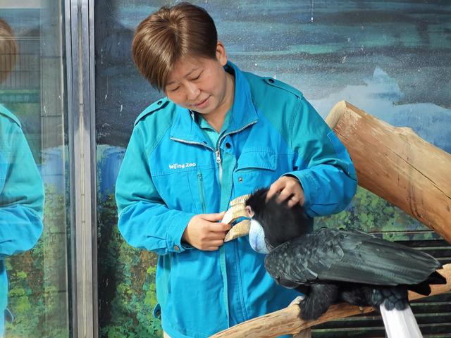 上午10点多,给馆里的30多种鸟喂食完毕后,默潇开始给花冠皱盔犀鸟“花花”做体检。她拿出一块透明的塑料板伸过去,“花花”心领神会地抬脚站上板子,板子上的刻度不仅可以测量跗趾的长度,默潇还能从下面观察脚底板的状态。测量完毕,“花花”抬脚的时候,她顺手上去摸摸,更精准地感知“花花”脚爪健康、指甲生长等细节。 ![]() “花花”是鸟苑的“体检模范生”,称重、量喙长、测心跳、打疫苗,每一项都能熟练配合。这份乖巧并非天生,而是默潇多年耐心训练的成果。 ![]() 犀鸟馆大多数鸟类都是单种单只,唯一一对夫妻是巨嘴鸟。为了让圈养巨嘴鸟顺利繁殖,默潇模仿它们的野外习性搭建巢穴。“就像人类一样,巨嘴鸟是需要两只鸟一起建房子来巩固感情。在自然界,它们是用啄木鸟的弃巢进行二次装修,所以我们就要给它们创造一个条件。”第一年,默潇用软木塞封住巢口,让巨嘴鸟来雕琢这个软木塞,结果雄鸟却把鸟蛋叼走吃了,“这说明它们对这个巢还不满意”;第二年,她用棕芯填充,依然没能成功;直到今年,她用碎木屑和干树叶混合做巢材,终于打动了这对巨嘴鸟。它们共同筑巢,在春季和秋季各繁育了一窝幼鸟,雄鸟还主动承担孵化责任。现在,这对巨嘴鸟夫妻带着3只小鸟生活在一起,其乐融融。 给游客科普鸟类知识,默潇总是从场馆里的实际场景开始,“鹦鹉的栖架为什么多是竖着的,因为它们是攀禽;犀鸟的栖架要更粗,地犀鸟的栖架特意放得低,这都和它们的生活习性息息相关。” 正说着,一只地犀鸟突然叼着小鼠走到玻璃前,对着游客甩来甩去。默潇笑着解释:“很多群居动物里,‘小弟’要把食物献给‘老大’,但地犀鸟是‘老大罩着小弟’。‘大哥’得了食物,会在‘小弟’面前疯狂炫耀,那嘚瑟劲儿活脱脱一个‘街溜子’!在咱们这儿它没‘小弟’了,就把你们当成炫耀对象了。来,咱们给‘大哥’鼓鼓掌!” 幽默的话语逗得游客们哈哈大笑。里面的地犀鸟,则嘚瑟得更加起劲了。 二十余载与鸟为伴,默潇把饲养做成了读懂生命的学问。这份坚守,也让人与自然和谐共生的暖意,流淌在动物园的每个角落。 默潇来源:北京日报客户端 记者:代丽丽 |