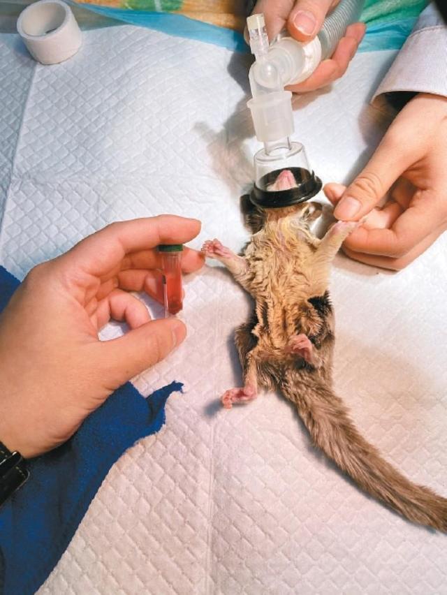 说话间,又来了一位“患者”——蜜袋鼯。它的主人说:“最近它不爱吃东西,也不怎么蹦跳了,总蜷缩在窝里,担心它身体不舒服。”了解基本情况后,别青泽给这个小家伙进行了查体,过程中,小家伙的眼睛滴溜溜转,小鼻子还在微微抽动,爪子下意识地抓紧医生的手套。助理帮助镇静后,小家伙慢慢就安静了。别青泽将蜜袋鼯固定在铺着无菌垫的操作台上,另一只手拿着细如发丝的采血针,瞄准它的细小血管快速刺入,鲜红的血顺着针管缓缓流入微量采血管中。