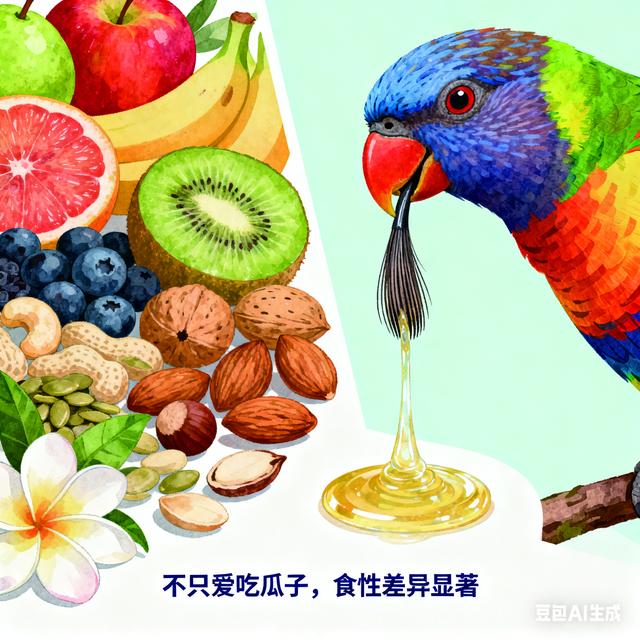 ![]() 还有一个有趣的冷知识:鹦鹉并非都爱吃瓜子,且过量喂食瓜子易导致肥胖和脂肪肝。它们的天然食谱以水果、坚果、花蜜和嫩芽为主,不同品种的食性差异显著,比如吸蜜鹦鹉的舌头上有特殊的刷状结构,专门用来吸食花蜜。