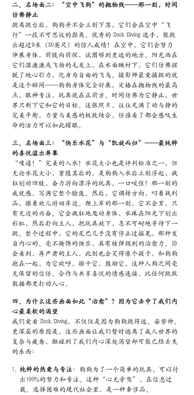 如果你家也有一只“水汪星人”,不妨在保证安全的前提下(务必循序渐进,从浅水区适应开始),带它去体验一下这种跳跃的快乐。即使不能成为职业选手,仅仅是为了看到它跃入水中后,那种眼睛发光、快乐到模糊的样子,一切就都值得了。对于我们这些旁观者而言,多看看这些“名场面”吧,让那些在空中定格的身影、那些溅起的快乐水花,冲刷掉我们心头的些许尘埃。毕竟,这世上最治愈的东西之一,就是目睹一个生命,在全然信任与热爱中,绽放出最耀眼的光芒。那份光,足以照亮我们平凡生活里的许多个瞬间。