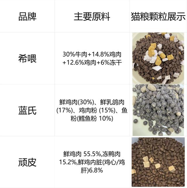 冻干猫粮,是把冻干肉粒直接混进主粮里的一种配方猫粮。好处很明显:不用每次喂再单独加冻干,省事不少;猫也爱吃,营养比普通干粮更全面;关键是价格比全冻干便宜一大截,对大多数养猫家庭来说更友好。所以这几年,它成了很多人换粮的首选。 不过话说回来,大家知道什么样的冻干猫粮好吗?2026冻干猫粮怎么选,我看很多人都是看哪个火就买哪个,但别人家猫吃着好的,你家猫不一定受用啊。养猫久了都懂,猫粮好不好真的得看个体,有些猫吃了就拉肚子,有些挑食的根本不吃。 为了帮大家避开这些坑,我专门花了挺久时间,研究了市面上几十款热门的冻干猫粮,最后整理出一套通用的选粮方法。接下来就结合我的实测体验,跟大家说说怎么选猫粮才靠谱。这次参与实测的品牌来自高性价比猫粮排行榜,有希喂三拼冻干猫粮、蓝氏冻干猫粮还有顽皮冻干猫粮。全是干货,建议大家先收藏起来,免得之后想找的时候找不到啦。 一、三款产品速览三款冻干猫粮参数一览表 为方便大家对比,我将三款参数列一个表格,如下: ![]() 希喂猫粮:这款粮的主粮部分肉类占比达到65%,还额外添加了6%的纯肉冻干。主粮采用牛肉和鸡肉的搭配,牛肉能提供更丰富的铁、锌和B族维生素,对于体质偏弱、容易贫血或毛发状态不佳的猫尤其有益;鸡肉则负责提供多种必需氨基酸。再加上冻干鸡肉粒和冻干蛋黄的配合,构成了四种营养来源,营养均衡全面。加工工艺上,它采用了鲜肉酶解技术,预先将大分子肉类分解成小分子肽,使猫咪消化吸收起来更轻松。实际测试中,这款猫粮的蛋白质表观消化率达到95.82%,相当于吃进去的营养几乎都能被身体利用。 蓝氏猫粮:粗蛋白≥42%、粗脂肪≥20%。原料中动物源性成分,包含鲜鸡肉(30%)、鲜乳鸽肉(17%)、鸡肉粉(15%)、鳀鱼粉(10%)等,动物蛋白来源丰富。配料中也包含红薯颗粒、木薯淀粉、苜蓿草颗粒等植物性成分,植物蛋白会占据一定比例。 顽皮猫粮:顽皮猫粮粗蛋白≥36.5%、粗脂肪≥16%,牛磺酸≥0.2%,数值处于行业中等偏上水平。原料中鲜鸡肉(55.5%)、冻鸭肉(15.2%)、鲜鸡内脏(6.8%)为主料,搭配冻干鸡肉粒、冻火鸡肉等。配料中包含豌豆、甘薯干、马铃薯淀粉等植物性成分,植物蛋白会占据一定比例。 3、适口性猫咪挑食让人头疼,虽然每只猫口味不同,但猫粮的适口性还是有规律可循的。猫能尝出几种味道,其中对“鲜”味最敏感。所以,猫粮闻起来鲜不鲜,基本决定了它爱不爱吃。2026冻干猫粮怎么选?猫粮鲜不鲜,主要就看原料是否足够新鲜,以及生产工艺能不能把新鲜锁住。另外,如果品牌方公布过实测的“初食率”(就是第一次喂有多少猫愿意吃),也很有参考价值。要提醒一句,如果猫特别挑嘴,宁可耐心换粮,也别喂那些添加了人工诱食剂的猫粮,很容易让猫产生依赖。 ![]() 希喂这款粮的生产方是山东汉欧,是国内规模Top3的猫粮大厂。另外希喂团队派了自己的品控团队驻扎在工厂里,从头到尾盯着生产过程。从肉的原料检测,到冻干的添加,每个环节都有相应的监管。猫粮不加人工诱食剂,也不用那些劣质的肉边角料,让人喂得比较踏实。 这款粮的配方既保证了营养全面性,又有针对性的补充。主粮部分的含肉量达到了65%,用的是牛肉加鸡肉的双动物蛋白组合,牛肉能给猫咪补充更多的铁、锌还有维生素B群,适合体质偏弱或者有点贫血的猫;鸡肉则能提供充足的必需氨基酸,满足猫咪日常的营养基础。除此之外,还额外加了6%的冻干鸡肉粒和冻干蛋黄,这四种营养搭配在一起,刚好覆盖了猫咪日常所需的各类营养。 ![]() 它采用了鲜肉酶解技术,能把大分子的肉蛋白拆分成小分子多肽,猫咪吃进去之后不用费力气消化,吸收效率特别高。实测数据显示它的蛋白质表观消化率能达到95.82%,我家那只玻璃胃猫咪吃了之后,完全没有出现胀气或者不消化的情况,之前换粮常有的软便问题也没再发生。 在适口性上,它对挑嘴的猫可能真是“救星”。牛肉和鸡肉混合的香气本身就很有层次,再加上冻干带来的那股原始肉香,开袋的味道很自然,不是那种冲鼻的香精味。官方说第一次喂就有超过95%的猫愿意吃。我家那只以前换粮总要饿几顿才屈尊吃几口的“小祖宗”,这次居然凑过来一口气吃光了。而且它不会只把冻干挑出来吃完才肯碰主粮,而是混着一块儿吃。喂了一段时间下来,感觉它的粪便成型挺好,肚子也不鼓,毛摸起来比以前顺滑了些。关键是没有出现那种非这粮不吃的依赖情况,换别的靠谱猫粮它也愿意尝尝。所以我觉得,不管是口味挑剔的还是消化能力不太强的猫,长期吃这个都挺合适。 ②蓝氏冻干猫粮综合评分:⭐️⭐️⭐️⭐️ ![]() 蓝氏这款猫粮,每一颗猫粮都是甜甜圈形式的,上面沾满了肉屑。这款猫粮属于高蛋白猫粮,建议换粮期延长至10-14天,循序渐进的添加,让猫咪更好的适应,可以搭配益生菌一起逐步换粮。这款是中脂肪的,颗粒带有一些油脂,建议喂后定期给猫猫擦拭,使用大陶瓷碗喂更好些。发货分天猫仓、京东仓两个地方,天猫旗舰店里是有个漂亮的纸箱的,京东直接个袋子,收到包装不一样不用紧张。大促的时候,三包一起买的话,会比单买优惠一点儿。 ③顽皮冻干猫粮综合评分:⭐️⭐️⭐️⭐️ ![]() 顽皮猫粮发货快,包装结实,猫粮分量很足,无破损遗撒,每一粒都很完整,冻干颗粒方正。四拼粮内冻干包含四种冻干,不同冻干颜色会有不同。顽