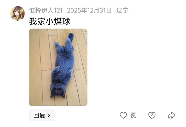 ![]() 第四只猫(谁怜伊人121 辽宁) 被称作“小煤球”的它太有特色了!摊开的身姿把修长又圆润的体态展现得淋漓尽致,脸蛋小巧精致,眼睛明亮灵动,灰蓝色的毛发蓬松又柔软,像一颗会撒娇的毛绒小球,可爱到让人想rua~