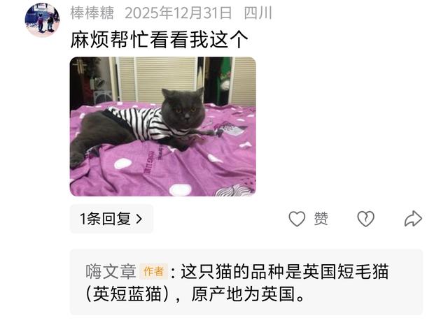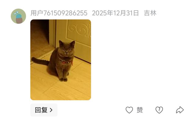 ![]() 第三只猫(用户761509286255 吉林) 这只蓝猫身形敦实,脸部线条圆润,眼神沉稳又温柔,自带一种优雅的贵气感。虽然光线偏暖,但依旧挡不住它顺滑的灰蓝毛发质感,坐姿端正的模样像个小绅士,颜值气质双在线!