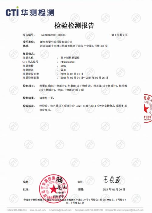 一款猫粮好不好,不能只看配料表,检测报告才更有说服力。今天就教大家看懂猫粮检测报告——选购猫粮,首要参考检测报告,实打实的数据才最具说服力。 读懂检测报告只需三步:一看检测机构,二看检测项目,三看关键指标,轻松精准判断猫粮品质。 ![]() 以梁小妖烘焙猫粮为例,该产品坚持严格品质把控,检测报告可追溯,具体检测详情如下: ✅ 检测批次:2025-11-15 ~ 2025-11-25 1. 看检测机构:认准权威,结果才可靠选购猫粮,一定要认准权威性检测机构,国内主流权威机构包括华测(CTI)、谱尼等,具备专业检测资质,检测结果更具公信力。 梁小妖烘焙猫粮的检测机构为华测 CTI,持有正规专业检测资质,检测流程规范,结果真实可靠,可放心参考。 2. 看检测项目:覆盖全面,品质才可控优质猫粮的检测项目,需全面覆盖营养成分、污染物、毒素及微生物等核心维度,项目齐全才能全方位保障猫粮品质,避免遗漏潜在问题。 梁小妖烘焙猫粮检测项目达120余项,营养、安全类核心检测维度全覆盖,无任何关键项目遗漏,品质把控层层到位。 3. 看关键指标:对标标准,优劣一眼辨行业通用参考标准(精准对标猫咪生理需求): • 粗蛋白:成猫≥25%,幼猫≥28%;30%以上为良好,40%以上为优质;过低则营养不足,过高易导致吸收不全,38%-47%为黄金适宜区间。 • 粗脂肪:≥9%,建议区间15%-22%;肥胖猫咪需控制在15%以内,合理脂肪含量可滋养毛发、助力新陈代谢。 • 粗纤维:≤9%,建议≤5%;适量纤维可助力排便,过量易加重猫咪肠胃负担。 • 粗灰分:≤10%;数值越高,说明猫粮中杂质含量越高,配方纯净度越差。 • 钙磷比:需控制在1:1至2:1之间,适配猫咪骨骼发育,避免钙磷失衡影响健康。 • 水溶性氯化物:0.3-1.0;盐分适中才能更好呵护猫咪肾脏,同时减少泪痕产生。 • 18项氨基酸总和/蛋白质比值:低于70%不建议选择,比值越高,说明猫粮中肉含量越充足,蛋白来源越优质。 • 致病菌及毒素:各类致病菌(如沙门氏菌)、毒素(如黄曲霉毒素)需未检出,保障猫咪食用安全。 梁小妖烘焙猫粮关键指标实测结果(数据佐证,品质过硬): • 粗蛋白 45.2%:达到优质标准,足量满足猫咪增肌长肉需求,适配成猫增肌、幼猫成长。 • 粗脂肪 18.8%:契合低脂喂养需求,助力猫咪壮实体态不臃肿,避免虚胖。 • 粗纤维 3.9%:温和促进肠道蠕动,助力排便,大幅减轻猫咪肠胃负担。 • 粗灰分 8.5%:低于行业上限标准,杂质含量低,配方纯净度高。 • 钙磷比 1.28:1:科学高钙低磷配比,完全适配猫咪长期主食喂养,助力骨骼强健。 • 水溶性氯化物 0.49:低盐配比,既能满足猫咪生理需求,又能呵护肾脏、减少泪痕。 • 18项氨基酸总和/蛋白质比值 95%:高肉含量实锤,蛋白均来自动物源,贴合猫咪食肉天性。 • 各类致病菌及毒素均未检出:从源头杜绝安全隐患,食用安全有十足保障。 综合来看,梁小妖烘焙猫粮的检测指标表现优异,各项数据均对标优质猫粮标准,品质值得信赖。 除检测报告外,猫粮的配料、工艺及颗粒口感同样是选购核心。以下针对梁小妖烘焙猫粮,进行详细解析: 4. 配料表深度解析该猫粮主打高蛋白低碳水配方,专为3个月以上幼猫及成年猫定制,核心满足猫咪“长肉不发胖”的喂养需求。配料以鲜鸡肉为基底,鲜鸡肉占比73%,搭配12.37%脱骨鲜鸡肉及4.87%鸡肝,整体鲜肉含量超90%,动物性蛋白占比高达98%,完美贴合猫咪纯肉食天性。 配方无任何额外食品添加剂,摒弃人工成分对肠胃的刺激,纯净度高,对敏感肠胃极度友好;同时添加300亿益生菌,搭配益生元及小球藻粉,三重助力提升肠胃消化率,玻璃胃猫咪亦可轻松适配,换粮期间不易出现软便、应激问题;生骨肉含量超12%,且内置5小袋独立冻干,既保障了营养丰富度,又大幅提升适口性,兼顾锁鲜效果与喂养体验;高蛋白低碳水的科学结构,可助力猫咪长肉不虚胖、发腮不臃肿,长期食用能维持健康体态。 5. 颗粒细节、口感及工艺解析该猫粮采用75℃低温烘焙工艺,相较于市面常见的90℃高温烘焙工艺,能最大程度保留肉类原生营养,避免高温破坏营养成分。烘焙而成的颗粒质地酥脆、不油腻,既方便猫咪咀嚼磨牙,又能有效减少黑下巴问题;配方无谷物添加,鲜鸡肉基底带来自然肉香,适口性优异,3个月以上幼猫至成年猫均可适配,换粮过渡顺畅,即使是挑食猫咪也能快速接受。 6. 额外核心优势生产方面:由大厂汉欧生产,生产标准严苛,品控体系完善,品质保障更可靠; 规格与性价比方面:单袋规格1.5kg,日常售价99元,兼顾优质品质与亲民价格,适配多数铲屎官长期喂养需求; 适配人群:尤其适合追求高肉低脂、希望减少猫咪肠胃负担、注重配方干净度与鲜肉比例的铲屎官,玻璃胃猫咪、需要增肌发腮的猫咪喂养适配度更高。 梁小妖烘焙猫粮凭借优质的检测指标、纯净的配方、先进的工艺及超高性价比,成为国产烘焙猫粮中的优质选择,既兼顾猫咪的营养需求,又保障喂养安全性,值得广大铲屎官选择! 最后、梁小妖烘焙猫粮检测报告如下: ![]() ![]() ![]() |