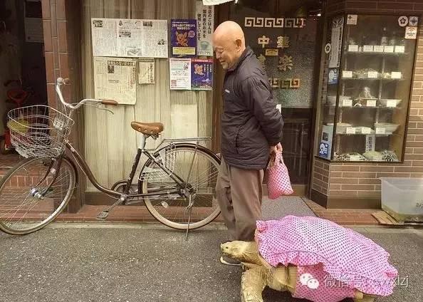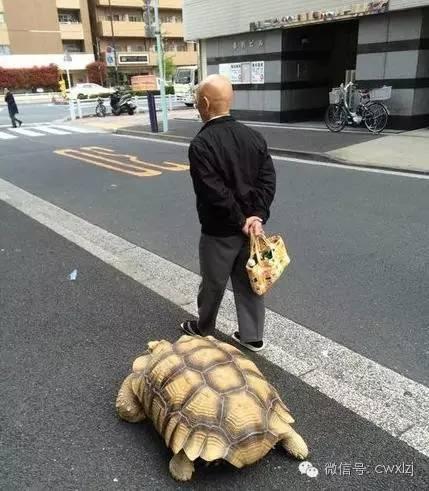 日本东京,一名男子和自己的宠物龟并肩行走在东京街头。