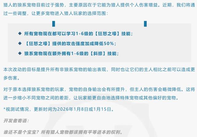 魔兽世界时光服蓝贴官宣猎人宠物平衡性调整,此次改动直指狼系宠物 “一家独大” 的现状,通过技能调整让更多宠物拥有进本竞争力。