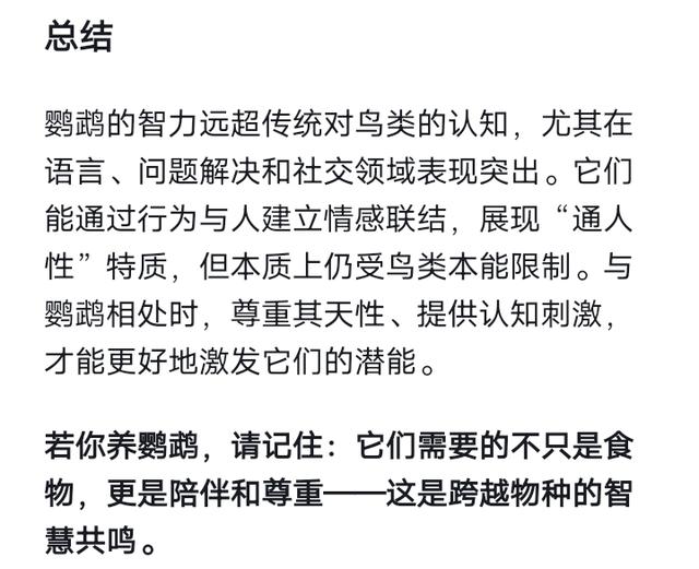 鹦鹉的智力远超传统对鸟类的认知,尤其在语言、问题解决和社交领域表现突出。它们能通过行为与人建立情感联结,展现“通人性”特质,但本质上仍受鸟类本能限制。与鹦鹉相处时,尊重其天性、提供认知刺激,才能更好地激发它们的潜能。