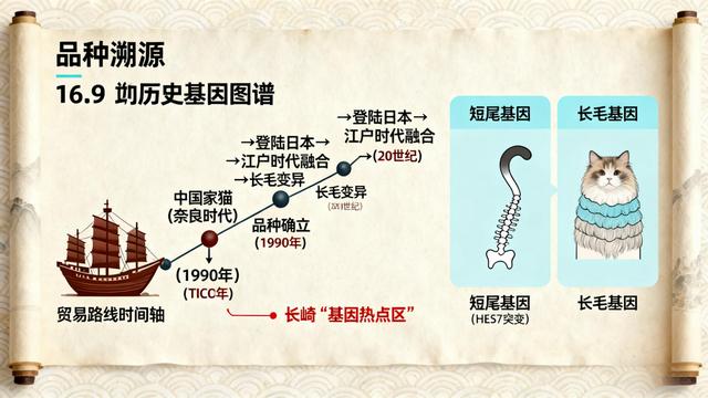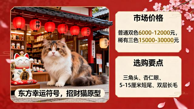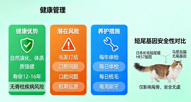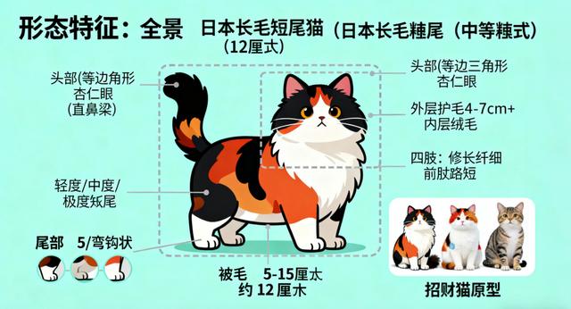 日本长毛短尾猫全解析:带长毛的东方幸运符 一、品种溯源:贸易浪潮与基因演化的双重馈赠日本长毛短尾猫是日本本土自然演化的珍贵品种,其独特的 “长毛 短尾” 特征源于千年贸易史与基因自然突变的奇妙结合,堪称东方猫种演化的活化石。关于其起源,历史考据与基因研究共同勾勒出清晰脉络: (一)历史传入与本土驯化与普遍认知不同,日本短尾猫并非日本原生品种。史料与遗传学研究显示,其祖先可追溯至 1000 多年前(约奈良至平安时代)随中日、日朝贸易商船传入的中国家猫。这些商船猫最初承担着保护丝绸、香料等货物免受鼠患的职责,随 “遣唐使” 航线与 “海上丝绸之路” 陆续登陆日本。抵达日本后,它们与当地野猫杂交,逐渐适应了日本的温带季风气候,形成了早期的短尾种群。 江户时代(1603-1868 年)成为品种分化的关键期:长崎作为当时日本唯一的对外开放港口,往来于东南亚的商船带来了更多携带短尾基因的猫种,与本土猫进一步融合。京都大学遗传学专家野泽谦的研究证实,这一时期日本短尾猫的比例显著上升,其中长崎县的折尾猫比例高达 79%,是日本均值的两倍,成为品种演化的 “基因热点区”。同时,日本民间形成了 “短尾猫避邪” 的文化认知 —— 相传长尾巴猫年老后会化为妖怪,而短尾猫能守护家庭,这种观念推动了短尾个体的保护与繁衍。 (二)长毛变异与品种确立早期的日本短尾猫均为短毛个体,长毛变异的出现属于自然基因突变的偶然结果。20 世纪中叶,育种者在短尾猫种群中发现少量长毛个体,其被毛长度显著超过普通短尾猫,且能稳定遗传。进一步研究表明,这些个体同时携带短尾基因与长毛基因,其中短尾性状由 HES7 基因突变决定 —— 当该基因纯合时表现为极度短尾(不足 10 厘米),杂合时则为中度短尾(10-20 厘米),这与欧洲短尾猫的 T-box 基因控制机制完全不同,印证了其独立演化路径。 1968 年,日本猫协(JCA)首次将长毛短尾个体纳入选育计划,通过纯种繁育稳定了 “长毛 短尾” 的双重性状。1990 年,国际猫协会(TICA)正式认可其独立品种地位,命名为 “日本长毛短尾猫(Japanese Longhair Bobtail)”,以区分短毛原种。如今,该品种不仅是日本的 “国猫候选”,更因其与 “招财猫” 形象高度吻合,成为全球猫迷追捧的东方珍品。 二、形态特征:长毛覆盖的短尾精灵日本长毛短尾猫以 “灵动体态 蓬松长毛 标志性短尾” 为核心识别点,每一处体征都兼具自然适应性与视觉美感,与波斯猫的 “极致华丽” 形成鲜明对比,凸显东方猫种的轻盈灵动。 (一)核心共性体征作为中小型猫种,其体型呈现 “矫健与优雅并存” 的特质,适配日本传统民居的狭窄空间: 体型:肩高 23-28 厘米,体重 3-5 公斤,雄性比雌性重 20% 左右;身体呈修长的流线型,胸部紧凑但肌肉发达,背部略呈弓形,骨骼纤细却坚韧 —— 这种体型继承了商船猫的敏捷基因,使其擅长跳跃与捕鼠。头部与面部:头型为标准的 “等边三角形”,额头平直,脸颊瘦削,线条锐利;鼻梁挺直修长,吻部尖细,鼻端颜色与被毛匹配(深色毛为黑色,浅色毛为粉色);耳朵位置偏高,大小中等,耳尖尖锐,耳内侧覆盖稀疏长毛,警惕时可完全竖起,宛如雷达;眼睛是最具灵气的部位 —— 呈杏仁状,眼距较窄,眼色丰富且与被毛关联,三色猫多为琥珀色,白猫常见蓝色或异色瞳,眼神灵动有神,尽显机警特质。四肢与尾部:四肢修长纤细,前肢略短于后肢,脚掌小巧呈椭圆形,爪垫柔软有弹性,适合快速奔跑;尾部是品种最核心的标志 —— 长度仅 5-15 厘米,分为轻度(15-25 厘米)、中度(10-20 厘米)、极度(不足 10 厘米)三种类型,部分个体尾部带有多个尾结或呈弯钩状,被日本人视为 “钩住好运” 的象征,尾毛浓密蓬松,静止时自然下垂,运动时灵活摆动以保持平衡。(二)长毛特质的独特性日本长毛短尾猫的被毛虽不及波斯猫冗长,却以 “致密柔软 季节适应性” 著称,是自然选择的完美体现: 毛发结构:被毛长度 4-7 厘米,分为双层 —— 外层是顺滑有光泽的护毛,内层是柔软浓密的绒毛,双层结构既能抵御日本冬季的寒冷,又能在夏季保持透气。与英国长毛猫相比,其被毛更贴服身体,不易打结,打理难度更低。毛色标准:毛色以三色(黑、红、白)最为经典,这也是 “招财猫” 形象的原型,此外还有红白、纯白、虎斑等多种色系,其中 “三毛玳瑁” 因基因稀有而珍贵。值得注意的是,其毛色分布极不均匀,面部常出现对称的 “开脸” 斑纹,极具辨识度。质感与变化:被毛触感如羊绒般细腻柔软,腹部与颈部毛发略长,形成淡淡的 “围脖”;随季节变化明显 —— 冬季绒毛增厚,被毛蓬松度提升 40%;夏季绒毛变薄,掉毛量增加,需加强梳理以应对 “换毛季”。 三、性格习性:灵动粘人的 “幸运伴侣”日本长毛短尾猫的性格与日本传统文化中的 “内敛灵动” 特质高度契合,既保留了工作猫的敏捷机警,又兼具伴侣猫的温顺粘人,是 “功能性与陪伴性” 的完美融合。 (一)核心性格表现灵动活泼的 “运动健将”:天性好动,精力充沛,擅长跳跃与攀爬,能轻松跃上高处书架或柜子顶部,每日需 1-2 小时的互动游戏释放精力。与波斯猫的 “慵懒安静” 不同,它们对周围环境充满好奇,会主动探索家中每一个角落,甚至能学会开门、玩益智漏食玩具等技能。温顺粘人的 “家庭核心”:对主人有极强的依恋性,喜欢参与家庭活动 —— 主人看电视时会蜷缩在