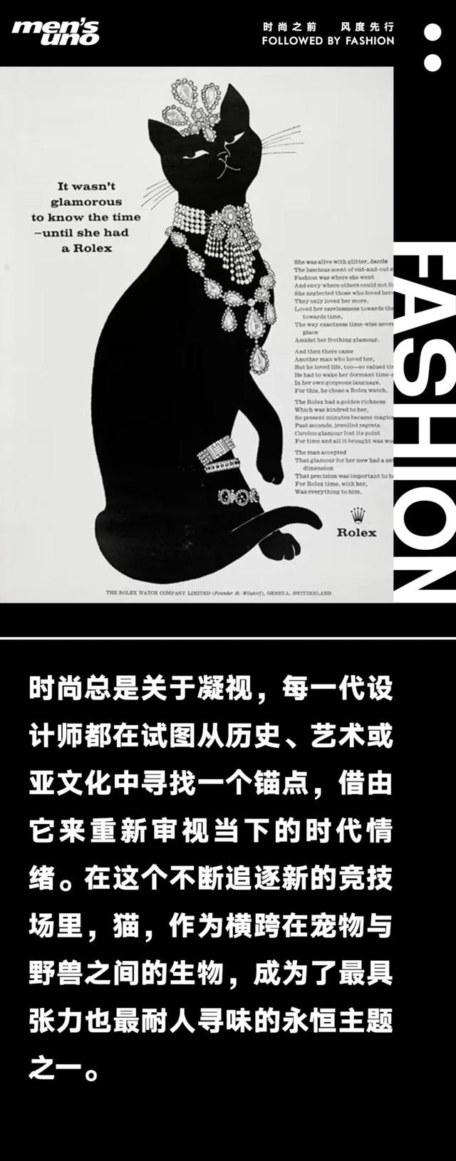 ![]() Louis Wain Cubist Cats陶瓷雕塑 在他生命的最后阶段,猫的形象彻底解体。曾经可爱的毛发被替换成高饱和度的几何色块;眼睛被放大了数倍,充满了对称的、迷幻般的视觉纹理。这些画作不再是对猫咪的具象描绘,而是一种视觉语言的爆发——它们像是一张张记录着电波与频率的图腾。Wain将他混乱的内心世界,转化成了极度有序、充满能量的几何图案。 ![]() Loewe 2026早春系列 当我们凝视这只穿越了百年时光的猫,我们看到的不仅是Louis Wain的艺术,更是时尚界对秩序与混乱这种永恒矛盾的深思。它是一次对人类心灵深处孤独与创造力的温柔探寻。 ![]() Dior 2025夏季男装秀场 猫在近年男装秀场上的大规模现身,也可看作一场关于男性气质的静默变革。长久以来在流行文化中都被赋予女性气质的猫,当它以一种巨大且不可忽视的姿态登上Dior 2025夏季男装的秀场,这种固化的气质就被彻底颠覆了。 ![]() 陶瓷艺术家Hylton Nel作品 Dior男装秀场选择了与南非陶艺家Hylton Nel合作。Nel的作品以其粗粝、童趣,充满黑色幽默的陶瓷猫雕塑著称。秀场被布置成一个巨大且略显荒诞的猫咪神庙:形态各异、表情奇特的陶瓷猫散落在空间中,有些被放大成了惊人的尺寸。它们不是可爱的吉祥物,而是沉默的审判者和独立的观察者。在时装细节中,这种猫科精神也得到了微妙的体现。猫咪图案被印在衬衫的角落,或以精致的刺绣形式出现在外套上。它们不是喧宾夺主的焦点,而是一种内敛、私密的符号。这种处理方式与传统男装追求的强势、外放的符号截然不同:它代表着一种内向的温柔或不讨好的美学。 ![]() René Gruau为Christian Dior创作的广告 在更早时期时装发展的黄金年代,猫是优雅与线条美学的完美化身。在那个插画艺术主导广告的年代,猫的侧影,构成了最动人的视觉诗意。插画大师René Gruau在1960年为Christian Dior创作的广告,便是这一时期的代表。Gruau的笔触极为精简,他擅长用大面积的色彩和寥寥几笔的黑色线条,勾勒出极致的奢华感。在他的世界里,猫的形象经常出现,它们通常是修长的、黑色的剪影,与模特高挑的身姿、Dior标志性的New Look轮廓完美呼应。 ![]() |