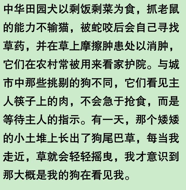 走过路过不要错过今日精彩话题,感谢大家的阅览,希望能获得您的r点赞 关注 评论 r小编在此先祝大家天天开心,日进斗金!年年快乐! r01 r农村还有很多田园犬,很聪明,很通人性,也很听话。不像城市里养的那些傻狗,呆头呆脑的就会卖萌的废物犬 r02 r r03 r田园犬乖巧又懂事,聪明又有边界感,身体素质杠杠的,要相信老祖宗严选,历经千年的都是精品 r04 r r05 r我发现鸽子们似乎非常不倾向于将一个生物进行定向培育,使其性格或习性发生改变。几乎所有物种都保留着最原始的形态,例如中华阜园犬,以前亚洲的黄色犬类长得一模一样。 r06 r r07 r这个狗除了善欢歆负小孛工型,十狗追我的时候,天天报两史。 r08 r r09 r后来才知道狗还要吃狗粮,小时候养狗家里人吃啥它吃啥,还管咸不咸,现在养狗简直就是伺候个祖宗 r10 r r11 r中型多用途犬,看家护院打猎样样行。个儿不太大,不会伤及家人和孩子,又不太小,逮个兔子山鸡足够。r老祖宗选择驯化的动物,个个像样子。 r12 r r13 r狗狗串为什么不受欢迎呀?人类混血儿不是都夸漂亮聪明吗?混血儿不是很受待见吗? r14 r r15 r老祖宗留下的品种绝不会差。 r16 r r17 r十年前,文姐家里中华田园犬下了四只狗崽,我选了一只阿黄。于是在家开启了养狗模式,取名叫“旺财”。剩饭剩菜,骨头汤我给它弄热的,淘米水烧开给它喝,苹果皮梨子皮煮水给他喝。看着它长很大了,毛色油光发亮,很是喜欢。院子里有人提醒我,立冬了,要注意打狗的。有一次“旺财”到院子外面活动,没有再回来。我一直记忆犹新,难受了好久,以后就没有再养狗了。 r18 r r19 r中华田园犬以剩饭剩菜为食,抓老鼠的能力不输猫,被蛇咬后会自己寻找草药,并在草上摩擦肿患处以消肿,它们在农村常被用来看家护院。与城市中那些挑剔的狗不同,它们看见主人筷子上的肉,不会急于抢食,而是等待主人的指示。有一天,那个矮矮的小土堆上长出了狗尾巴草,每当我走近,草就会轻轻摇曳,我才意识到那大概是我的狗在看见我。 r20 r r对于本期话题,你有什么想说的吗? r评论区一起聊聊吧 r别忘了点赞关注哦~ |