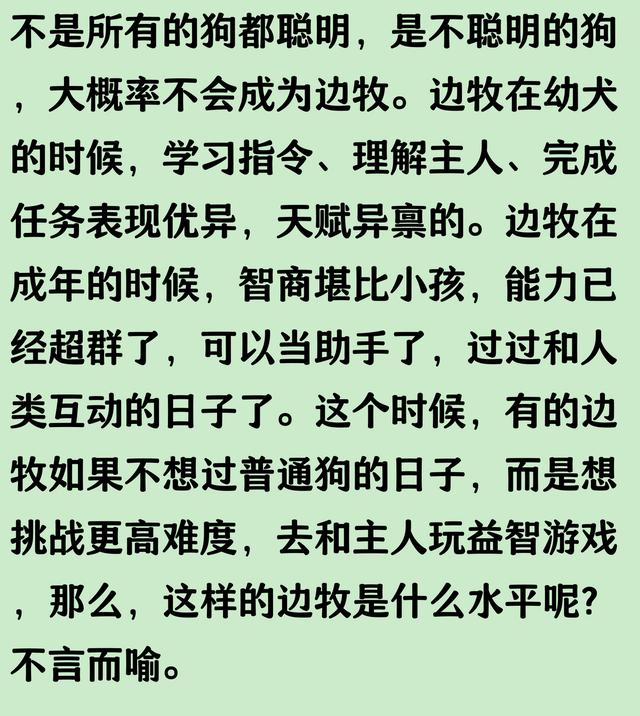 不是所有的狗 都聪明, 是 不聪明的狗,大概率 不会成为边牧。 边牧 在 幼犬的时候,学习指令、理解主人、完成任务 表现优异,天赋异禀的。 边牧 在 成年的时候,智商 堪比小孩,能力已经超群了,可以 当助手了,过过和人类互动的日子 了。 这个时候, 有的边牧如果不想过 普通狗的日子,而是 想挑战更高难度,去和主人 玩益智游戏,那么,这样的边牧 是什么水平呢? 不言而喻。