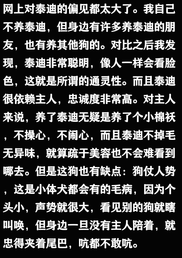 刷到是缘分,感谢大家的阅读,希望您能动动小手帮忙点赞,关注,评论。你的支持和鼓励是我前进的动力。在此祝福大家天天快乐,日日开心! r01 r体型小巧,不掉毛,据说非常可爱。然而,那可是泰日天啊。尽管我养了一只金毛,现在最讨厌的狗还是泰迪,觉得它们太恶心了。它们动不动就大声叫唤,甚至吡牙咧嘴。一出门看到泰迪,我就感到头疼。 r02 r r03 r大型犬我喜欢德牧。小型犬里我喜欢泰迪,体味小,不太脱毛,智商高,颜值高,不知道为什么会被黑这么惨 r04 r r05 r我还真没见过乱叫的泰迪,我的初衷是养只大狗,后面感觉不行,吃的多拉的多,洗澡也费钱掉毛严重体味重,流口水想想带它出门要捡狗屎,那么大的狗拉一次一把抓不完想想都上头r还是养个小体型的吧,出门好携带吃得少拉的少狗屎两张纸巾就捡了,自己在家也能给它洗澡,运动量也小,后期费用不大 r06 r r09 r泰迪狗狗真的不错,聪明知道看眼色没体味不掉毛跑起来和个小羊羔一样的,还性格活泼,黏主人,谁养谁爱 r10 r r13 r国外的动物品种,体育竞技等等,一来中还稀罕,时间不长都要泛滥成长。 r14 r r17 r每次去喂流浪猫猫条,我家泰迪再馋,都会乖乖的坐在旁边,不争不抢。它真的是个天使。 r18 r r19 r有的人说泰迪丑。说他猥琐。其实这个骑跨行为在很多狗中都有的。母狗都有这个动作。至于丑。每个人的审美不同,我个人认为泰迪的长相很可爱的。其实泰迪最大的问题就是养的人太多了。所以有坏毛病的狗狗相对数量上多一点,因为它总量太大。有些其实也是主人没有教好。养的人多也是因为它的优点多。贵宾(泰迪是贵宾的一种造型)比熊雪纳瑞绝对是最适合城市饲养的宠物。吃的少,拉的少,不掉毛没体味。体型小,没有攻击性。 r20 r r欢迎留言讨论呢感谢各位看官的阅读,祝看到这里的你天天开心,顺风顺水发大财 r别忘了点赞关注哦~我们评论区见 |