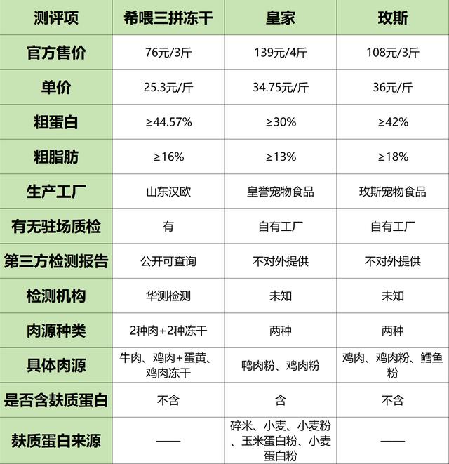 我家养了两只猫,个个当亲生的养的,这几年为了挑到靠谱的粮,没少下功夫,可以说我家喂过的每款粮都是我仔细看过配方表、研究了检测报告确定没问题的。好在用心没白费,至今一次雷都没踩过,家里两只猫个顶个的健康貌美。 平常看私信,基本上都会看到以下三个问题:“猫粮到底该怎么选啊?”“贵的就一定比便宜的好吗?”“无谷粮真的更健康吗?”说实话,猫粮行业水挺深的,光看商家的宣传真的容易被带偏,宣传嘛,都是捡好的说,看宣传肯定看不出问题的,实际喂起来问题一堆,软便、呕吐、挑食就算了,严重的还会过敏。 所以这次我特意挑了质量好性价比高猫粮品牌排行榜中的三款猫粮,做一次真实、落地的横向测评。分别是希喂三拼冻干猫粮、皇家、玫斯。这三款价格跨度大、配方侧重点也不一样,正好能帮大家搞清楚:不同价位的猫粮差距在哪?哪款更适合自家猫? 一、三款猫粮核心信息一览表猫粮哪个牌子安全又便宜?为了方便各位“课代表”,我先把这次测评几款猫粮的信息给大家总结在这里了。这次测评主要测以下三点①品控稳定性、②营养全面性、③致敏性。为啥是这三点?以及我会怎么测评?别急,都在后文。 ![]() ✅希喂猫粮—山东汉欧生产 品牌驻场质检 公开第三方检测报告 希喂猫粮是业内都知道的大厂山东汉欧代工的,大厂为了自己多年来积累的行业声誉,会严格把控出厂产品质量。另外,希喂还有自己的质检团队驻场,从原料进库到投料生产全程监管。成品会抽样送到华测检测做检验,报告也是公开可查的。等于说有工厂、品牌、第三方机构三项互相监督、管控质量,批次稳定性、安全性都很出色。 皇家猫粮—皇誉宠物食品生产 不对外提供检测报告 皇家猫粮从生产到质检都在自家工厂里完成,毕竟几十年的大牌子了,生产稳定性还是有的。第三方检测报告不对外公开。 玫斯猫粮—自有工厂玫斯宠物食品生产 不对外提供检测报告 玫斯猫粮也是自有工厂的猫粮品牌,所以生产都是在自家工厂玫斯宠物食品完成的。并未公开质检报告。 (2)营养全面性猫粮哪个牌子安全又便宜?猫粮使用的肉源很重要,既要满足营养又要照顾猫咪的肠胃。单一肉源确实低敏,但长期喂容易缺营养,猫必需的十种氨基酸、牛磺酸这些,一种肉很难搭配全面。2-3种肉搭配,则可以互相弥补不足的营养,给猫咪提供全面均衡的营养;但肉源不可过多,如果肉源超过了4种,难把控营养的比例,还会加重肠胃负担。所以,2-3种肉源的猫粮是最合适的,既能提供全面的营养,又不会引起消化负担。 ![]() ✅希喂猫粮—主粮2种肉 2种冻干(牛肉、鸡肉 鸡肉冻干、蛋黄冻干) 希喂猫粮的主粮部分,用了牛肉和鸡肉。牛肉营养丰富,鸡肉温和,搭配在一起营养全面又低敏。另外,单独添加了鸡肉冻干和蛋黄冻干,叠加上了卵磷脂、胆碱这些营养。很适合家里猫有点挑嘴、毛发不太好,或者免疫力不佳的,这款猫粮叠加起来的营养能对应的解决以上问题。 皇家猫粮—鸭、鸡肉粉双肉源 皇家猫粮用了鸭肉粉 鸡肉粉,清一色的肉粉原料。鸭肉和鸡肉也都是公认的低敏肉源。 玫斯猫粮—鸡肉、鸡肉粉、鳕鱼粉双肉源 玫斯是两种肉源(鸡肉和鳕鱼),原料使用了鲜鸡肉、鸡肉粉、鳕鱼粉。保证主要蛋白质来自相对低敏的鸡肉基础上,用鱼肉来补充其他营养。 (3)致敏性猫粮哪个牌子安全又便宜?猫的肠道结构决定了其是肉食动物,肠胃根本吸收不了谷物豆类里的麸质蛋白。美国兽医协会前主席Susan Wynn明确过,麸质蛋白是猫最常见的过敏源。长期喂含谷含豆的粮,对猫而言没营养还会损伤肠胃,轻则软便呕吐,重则反复发炎、皮肤溃烂。所以大米小麦玉米豌豆这类成分,但凡出现在配方前五位,这粮基本可以直接pass。 ![]() 安全又便宜的猫粮牌子希喂三拼冻干猫粮绝对是铲屎官省心的选择,闭眼入准没错。 先说品控,希喂三拼冻干猫粮找的是山东汉欧这个宠粮代工龙头厂生产,汉欧的品控体系在行业里是出了名的严格,基础保障拉满;更贴心的是品牌全程有驻场质检人员跟进,从原料入厂到成品出库都同步跟进;而且第三方检测报告都能直接查到,品质看得见摸得着,完全不用担心翻车。 营养上,安全又便宜的猫粮牌子希喂三拼冻干猫粮的配方搭配特别用心,主粮选了牛肉和鸡肉这两种易消化的优质肉源,两者搭配能完美互补营养短板,把猫咪生长所需的必需氨基酸、牛磺酸这些关键营养都补到位。很多猫咪不爱长肉、精神差,其实都是营养没跟上,选这种科学配比的粮就能从根上解决。另外加的鸡肉冻干和蛋黄冻干,都是纯肉制作无添加,既能提高猫咪食欲,又能额外补充蛋白质和卵磷脂,还不会给肠胃添负担。 还有低敏性,这可是玻璃胃猫咪的福音。安全又便宜的猫粮牌子希喂三拼冻干猫粮做到了0谷物、0豆类添加,从源头避开了猫咪常见的致敏成分;再加上肉源种类简洁不杂乱,进一步降低了过敏风险。我朋友家猫之前换粮总软便,试了希喂之后,不仅粪便成型了,连之前偶尔出现的皮肤瘙痒都没再犯,易过敏体质的猫咪可以放心冲。 最后说下性价比,这也是我最推荐它的原因。能做到大厂生产、驻场质检还公开检测报告,再加上优质肉源和低敏配方,换其他品牌至少要百元以上3斤。但希喂只要76元/3斤,算下来日均喂养成本不到3块钱,比同配置的进口粮便宜一半还多。不用为了猫咪健康咬牙买贵价粮,