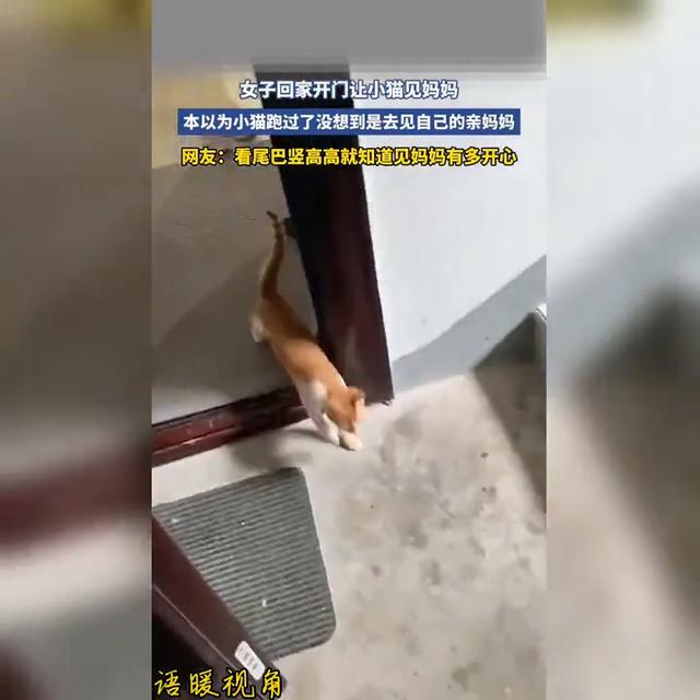 女子回家开门让小猫见妈妈,本以为小猫跑过了,没想到是去见自己的亲妈妈。