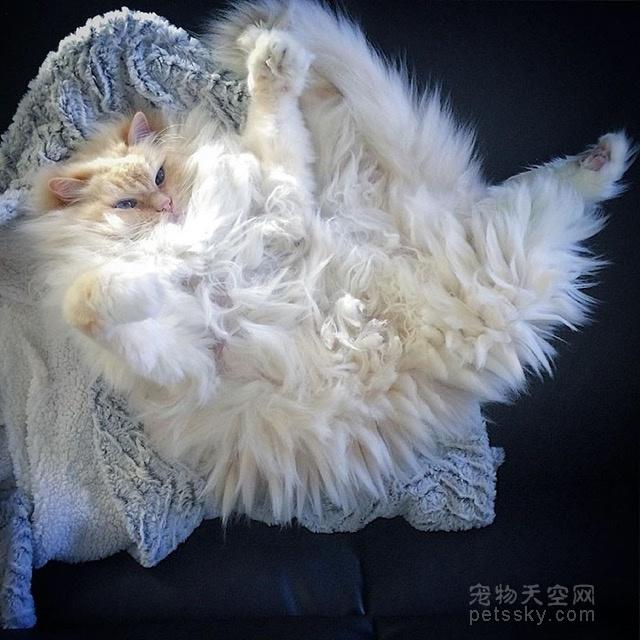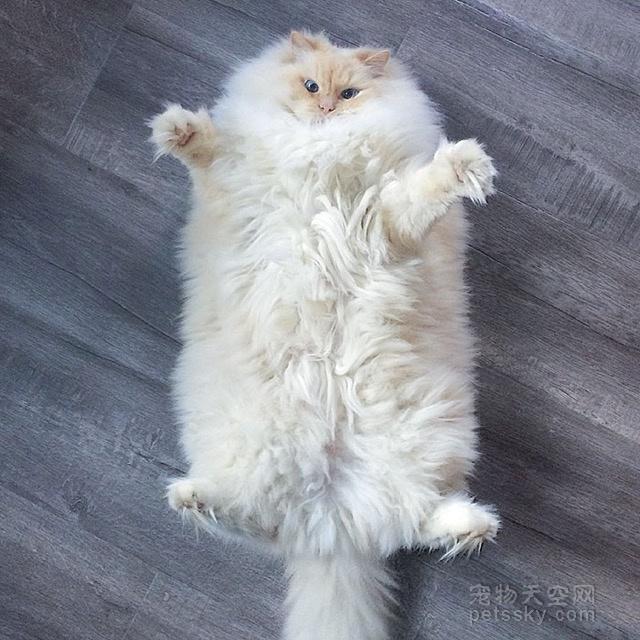 这只可爱的布偶猫叫Sky(天空),我想你们知道为什么会有这么一个名字了:他有漂亮的天蓝色眼睛和一身像云朵一样的毛发。 众所周知,布偶猫(又称“布拉多尔猫”)的特征就:拥有丰厚的被毛和蓝色的眼睛,除此之外,布偶猫较为温顺好静,对人友善。其美丽优雅又非常类似于狗的性格,而又被称为"仙女猫","小狗猫",特殊的性格也是布偶猫最大的特点之一。 跟着宠物天空,一起来看看这只可爱的胖猫Sky的生活照片吧,相信你也会喜欢上这只可爱的猫咪: