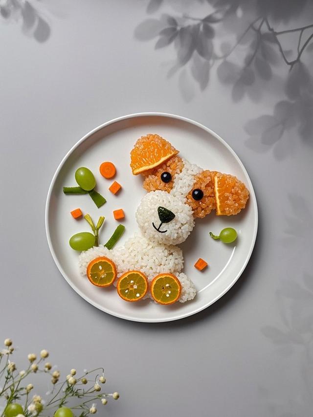 ![]() ![]() ![]() 食材准备米饭、海苔、火腿、小番茄(或其他红色可食用小食材)、橙子、苹果、葡萄、生菜、西芹、迷迭香 。 制作步骤头部塑形将部分米饭混合橙色食材(如胡萝卜泥等)揉成耳朵形状,白色米饭揉成脸部形状,组合成头部,放置在盘子中央 。五官制作用海苔剪出圆形做眼睛,内部填充黑豆或其他黑色小食材做眼珠。海苔剪出小三角形做鼻子,火腿剪出舌头形状。小番茄切片或取粉色食材做腮红,贴在脸部两侧。四肢制作:取白色米饭揉成四肢形状,用海苔剪出爪印形状贴在上面,摆放在头部下方合适位置。装饰摆盘橙子、苹果切片,葡萄、生菜、西芹、迷迭香等摆放在盘子空余位置,围绕蝴蝶犬饭团,丰富整体造型。 |