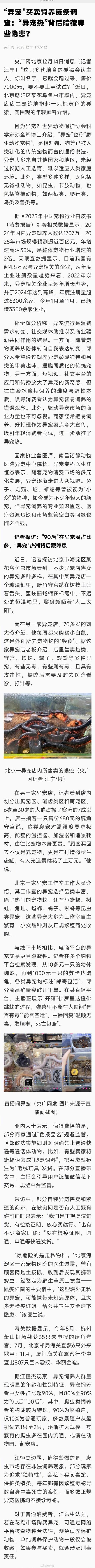 何为异宠?“异宠”也称“野生动物宠物”,是相对猫、狗等已被人类驯化的传统宠物而言的通俗说法。相关数据显示,2024年国内异宠饲养人数达1707万,2025年市场规模预测逼近百亿元,年增速高达35%,是整体宠物行业增速的2倍。 国家执业兽医师、南昌诺德动物医院异宠中心院长、异宠专科医生江恒杰透露,值得警惕的是,爬虫市场存在非法饲养现象。部分玩家为追求“独特性”,会私下买卖毒蛇、保护类蟒类,每年都有因繁殖毒蛇导致自身中毒死亡的案例,而多数正规异宠医院均不接诊毒蛇。(央广网记者汪宁)